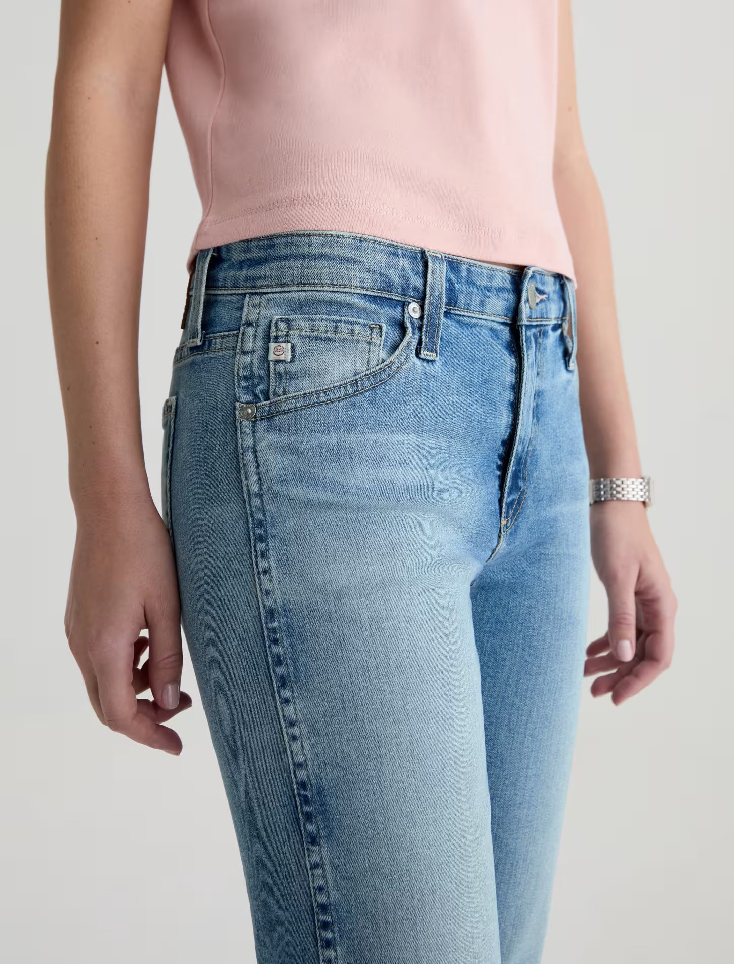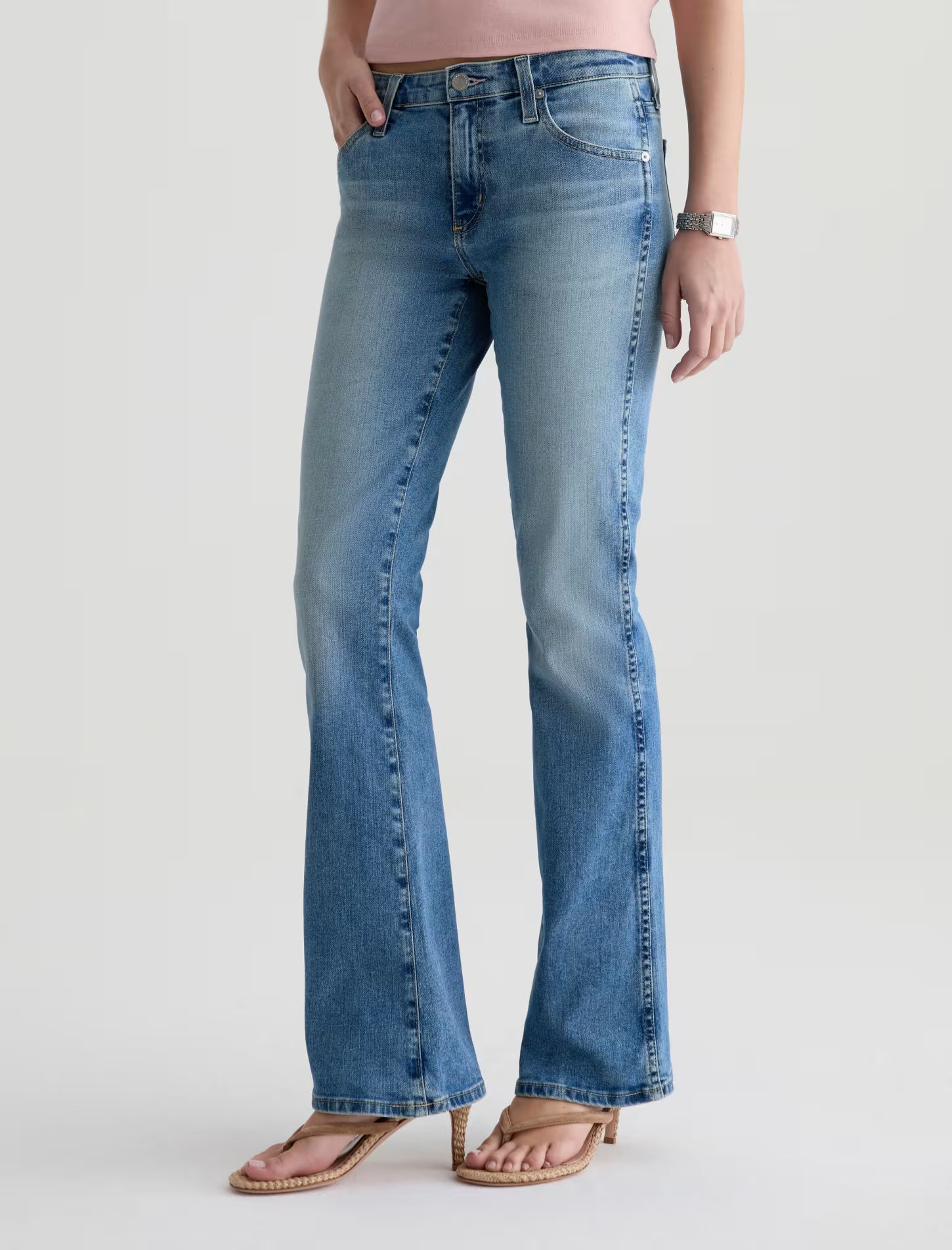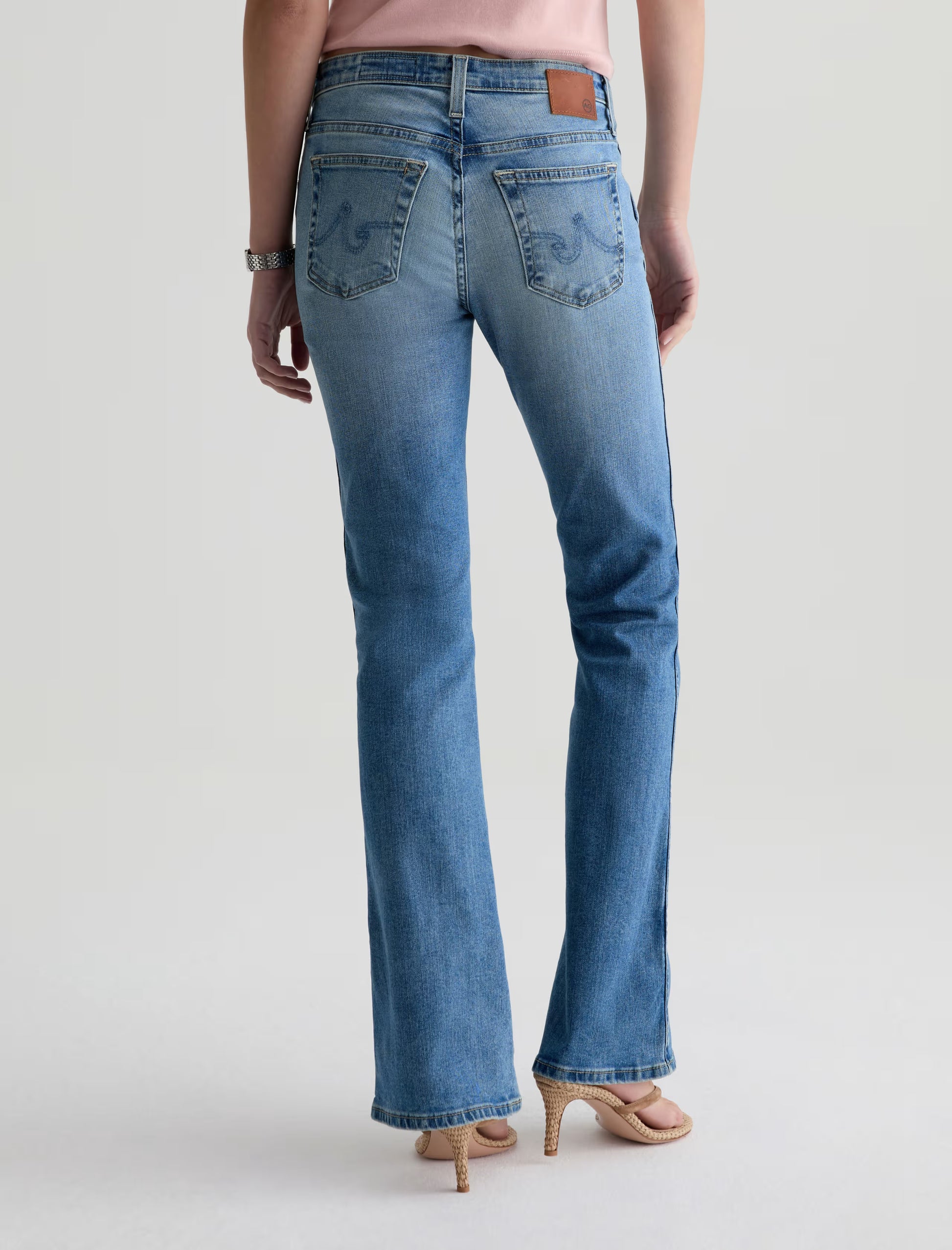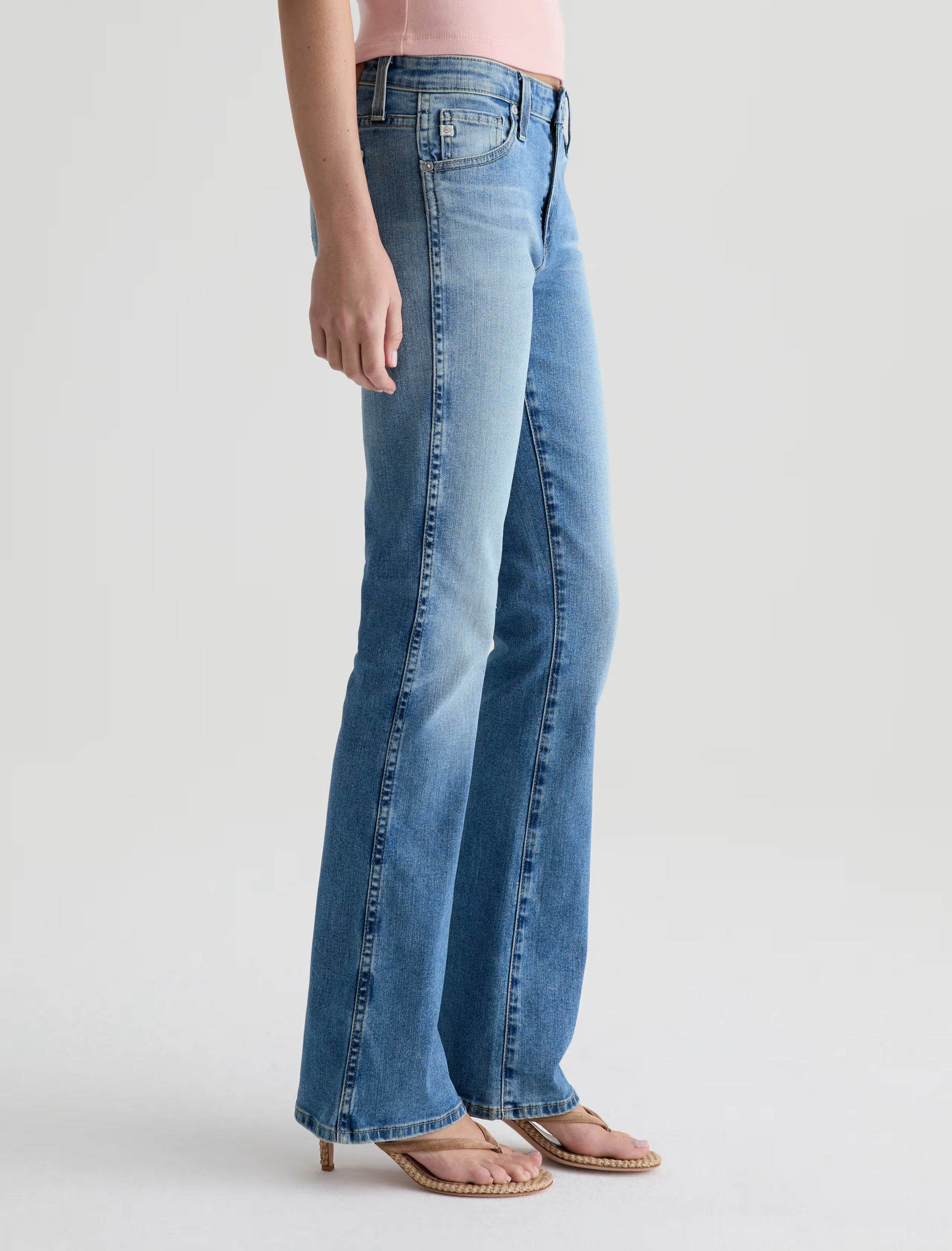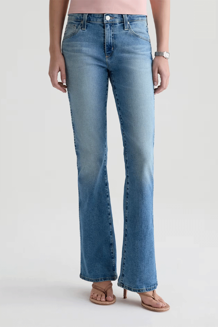 Angel is crafted from Empower Stretch Denim. This classic bootcut jean balances nostalgic proportions with a modern, sophisticated edge. This low-rise style is designed to elongate the frame with a close fit through the thigh that breaks into a subtle flare at the hem. Designed in our tinted medium blue wash, 15 Years Aviator, and finished to emulate 15 years of AG-ed™ wear through whiskering, fading, and contrasting indigo back pocket stitching.
