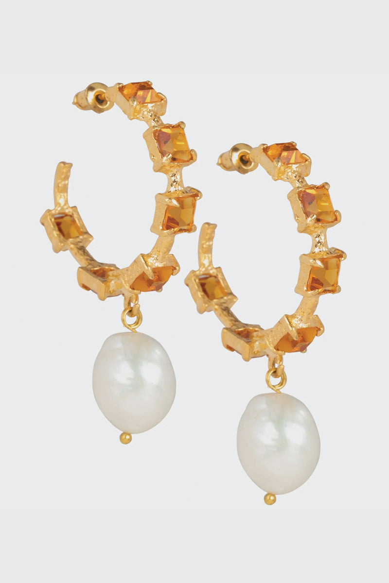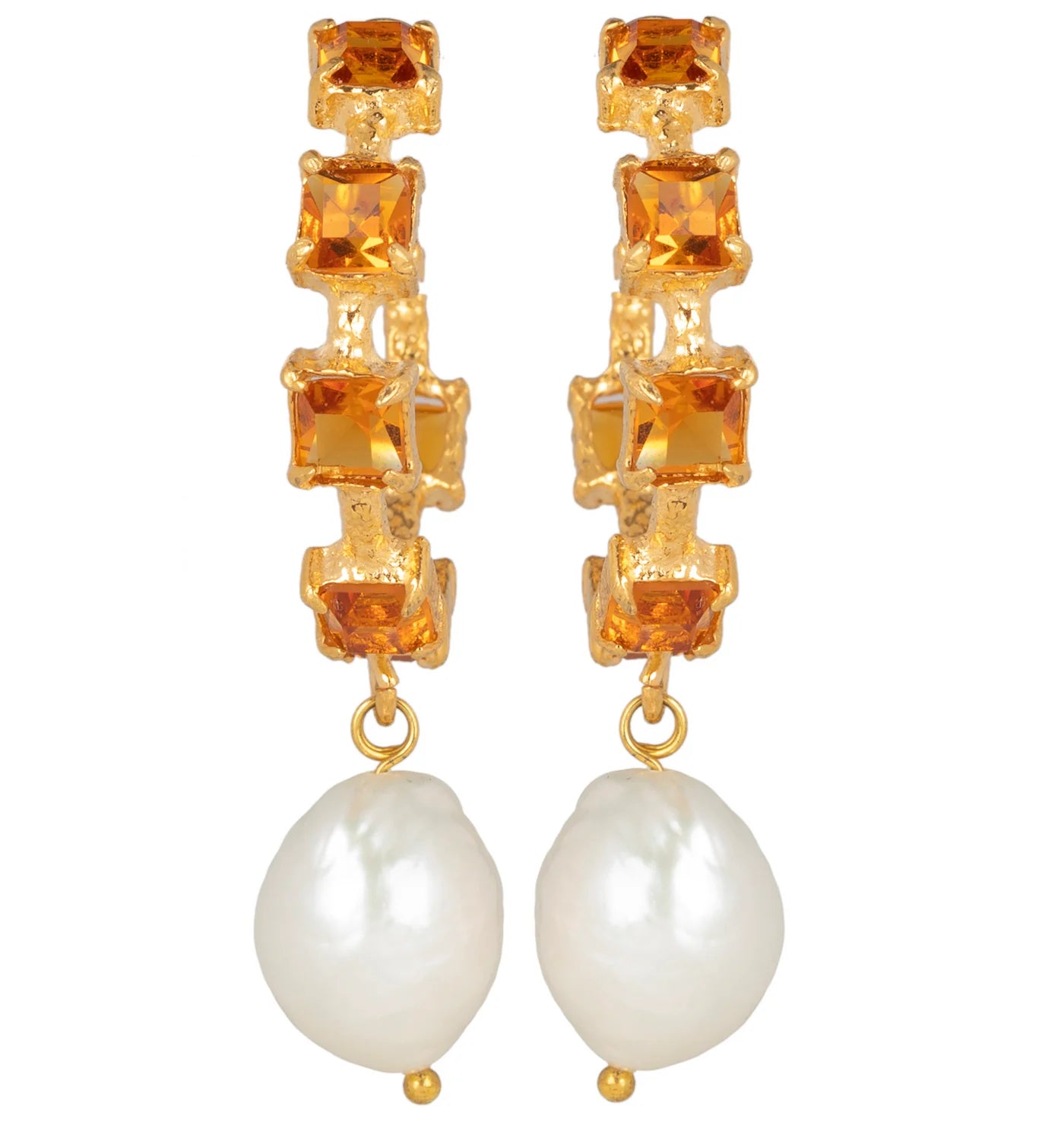 The handcrafted Anita earrings are adorned withAmber crystals, accented by lustrous, freshwater Baroque Pearls.