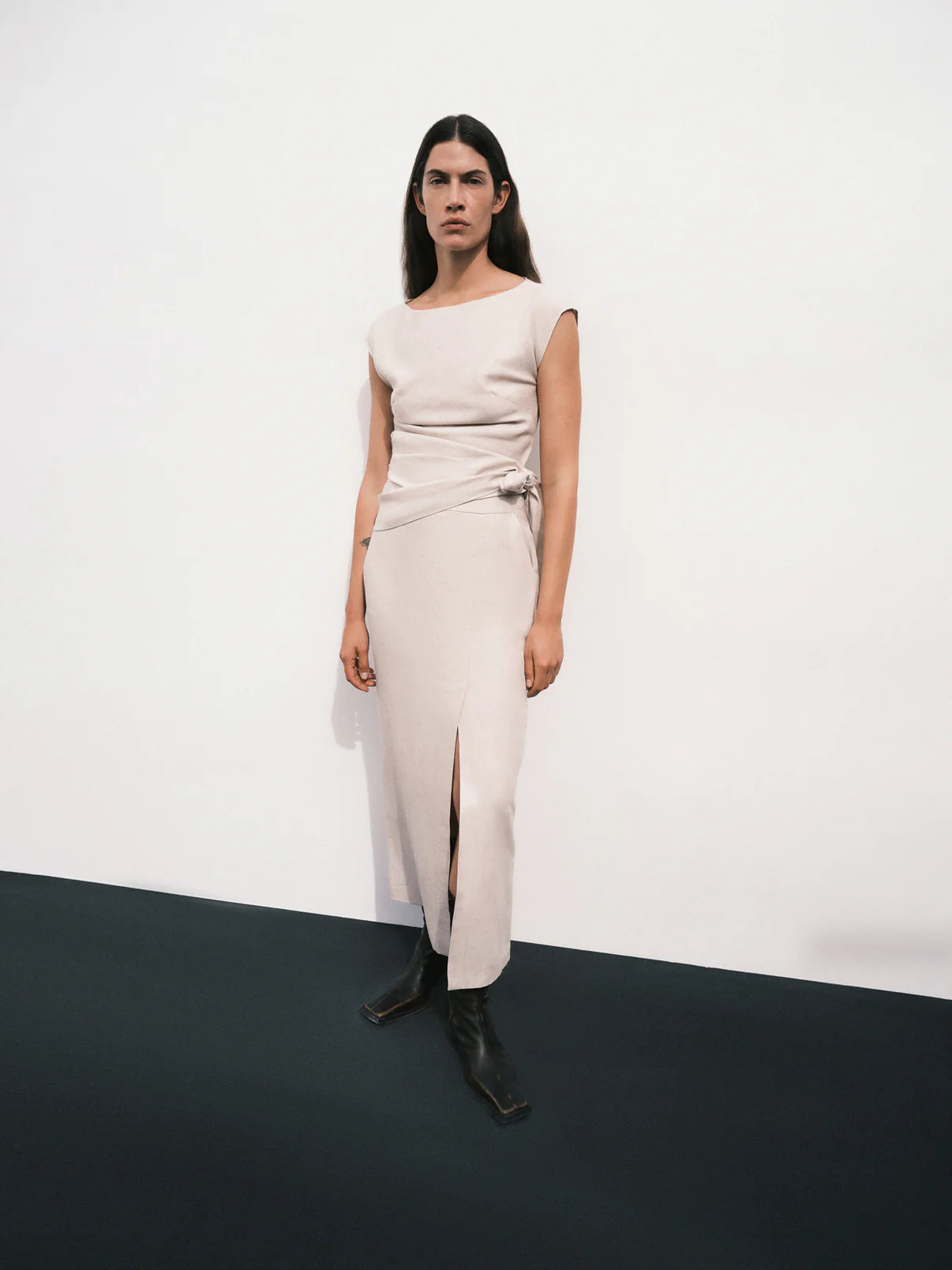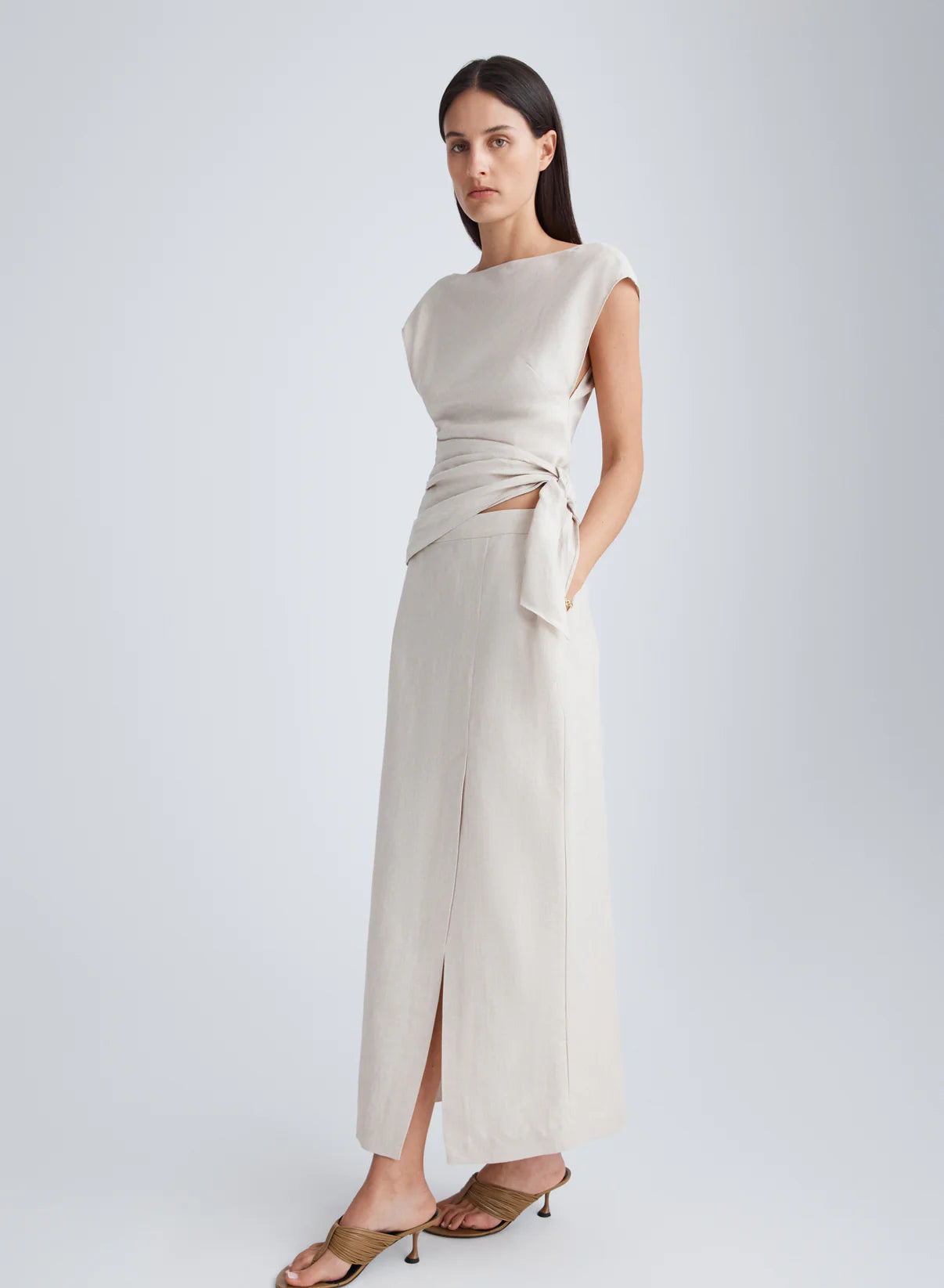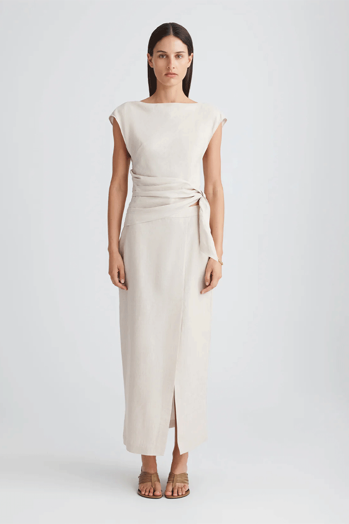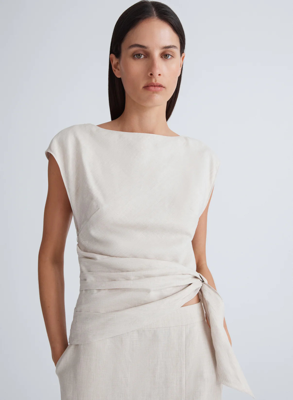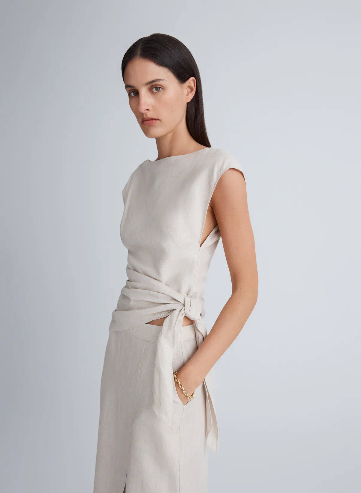 The Ellis Top in Stone is a softly sculpted silhouette defined by clean lines and fluid drape. Cut on the bias from a hemp and cotton blend suiting, it features a refined boat neckline and cap sleeves, balanced by an asymmetric hem and directional side tie overlay. Designed to contour through subtle tucks at the waist, it offers an elevated approach to modern tailoring.