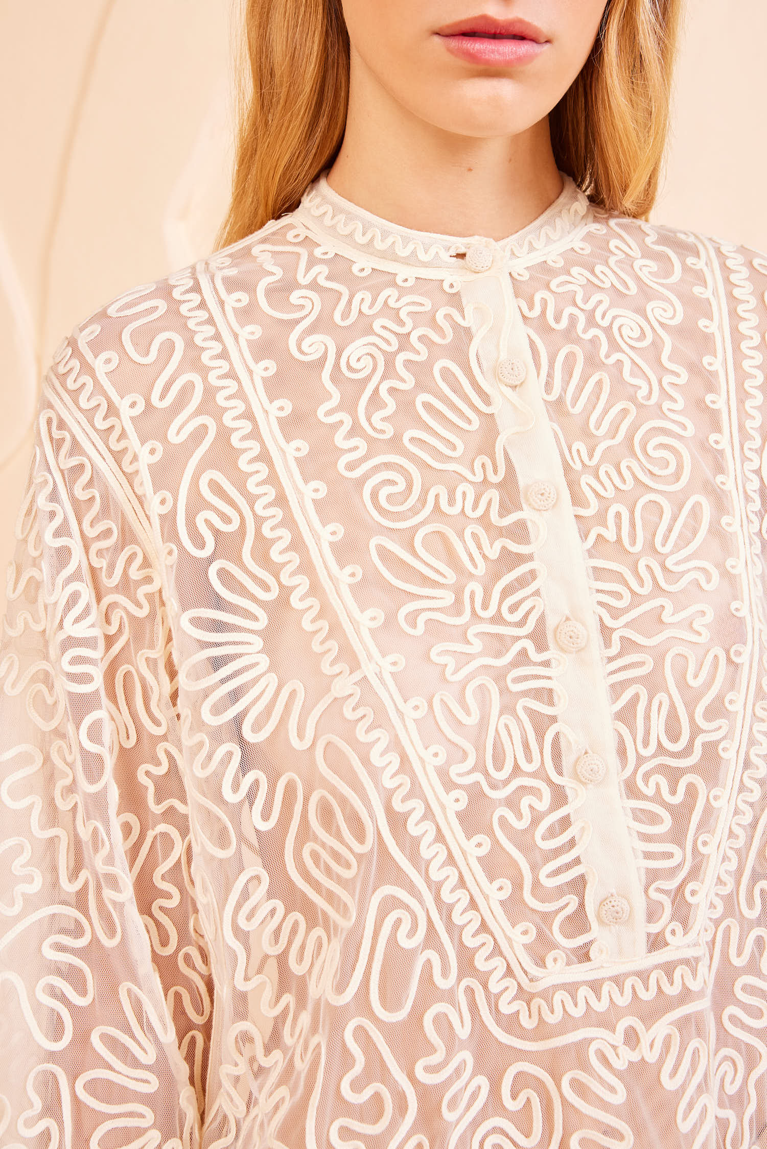 Arriving in Look 30 on our SS25 runway, the Esme Blouse is crafted from white tulle enlivened with ribbon embroidery in a geometric floral motif. This artful piece has long sleeves and is finished with solid, cotton-silk voile trims at the neckline, front, and cuffs. It fastens with crochet-adorned buttons and comes unlined for a play between sheerness and opacity.
