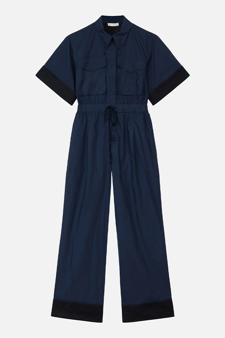 Utilitarian meets elegance in our Franz Jumpsuit. Inspired by traditional painter uniforms, this short-sleeve style defines the waist with an elastic drawstring, has patch and side pockets, and pools to an elongating wide leg. It fastens with tonal front buttons.