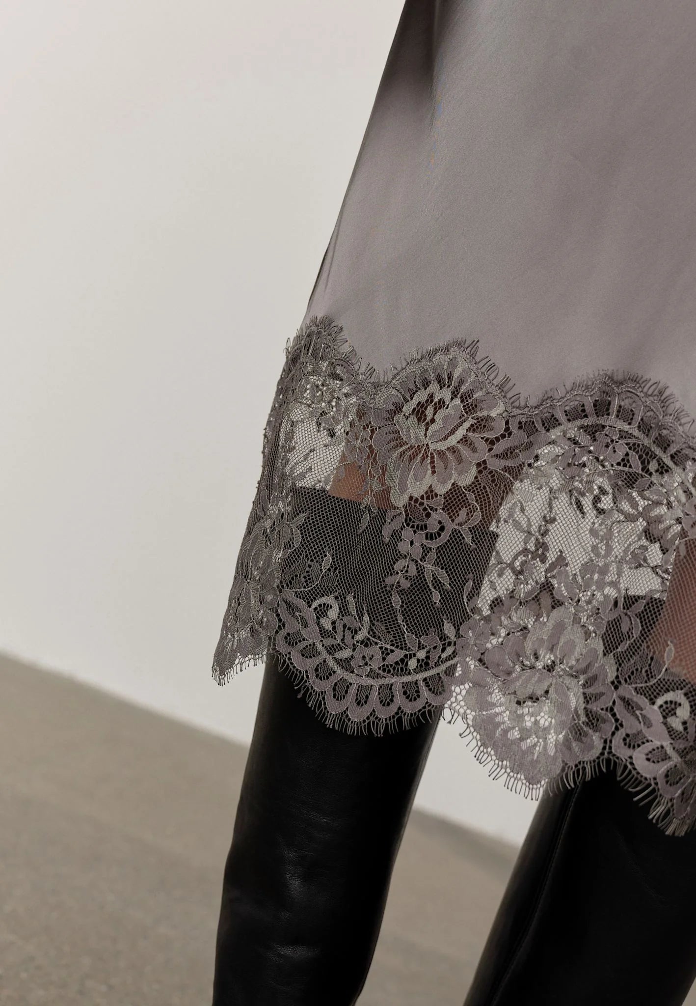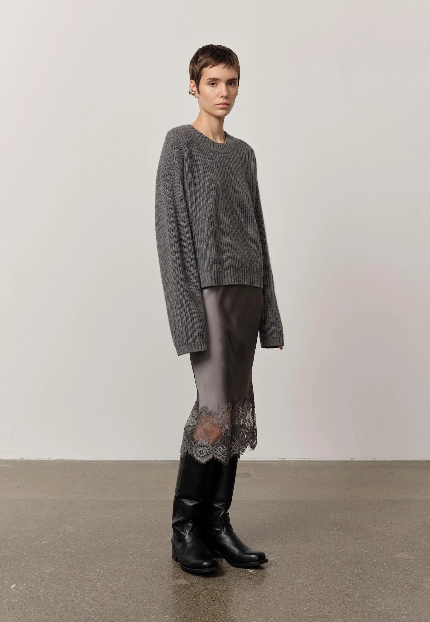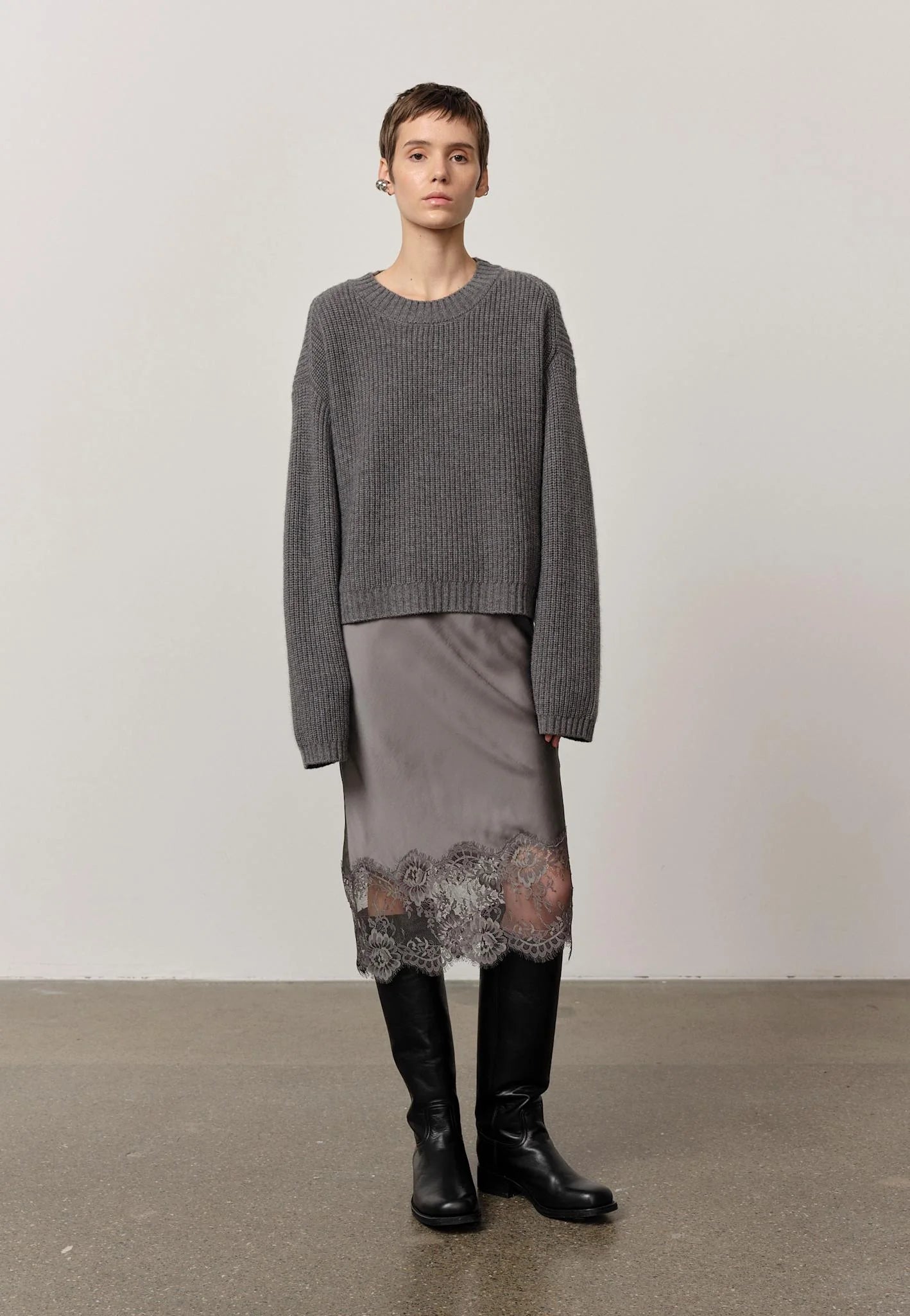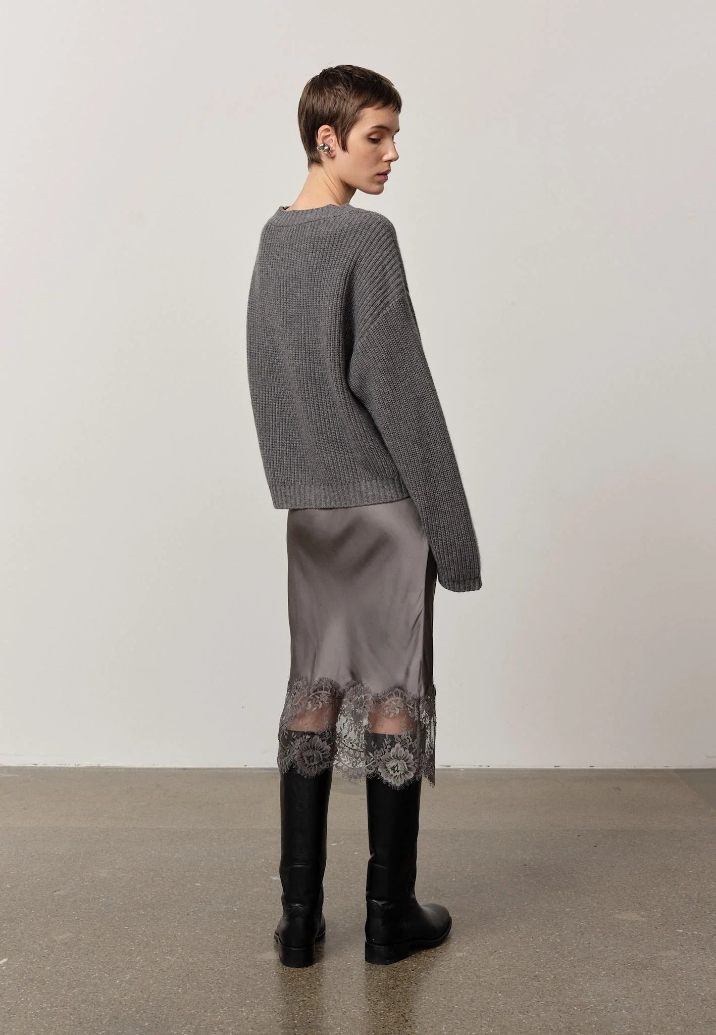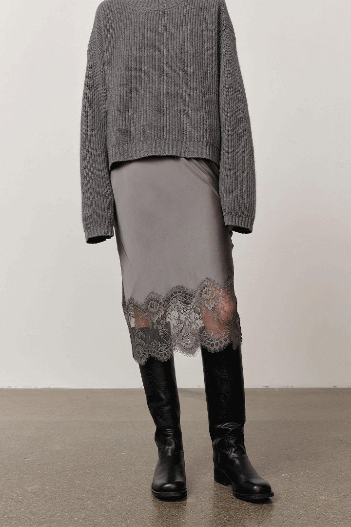 Introducing the Herbert Skirt: A fitted skirt featuring a small lace elastic waistband and lace detaling at the bottom.