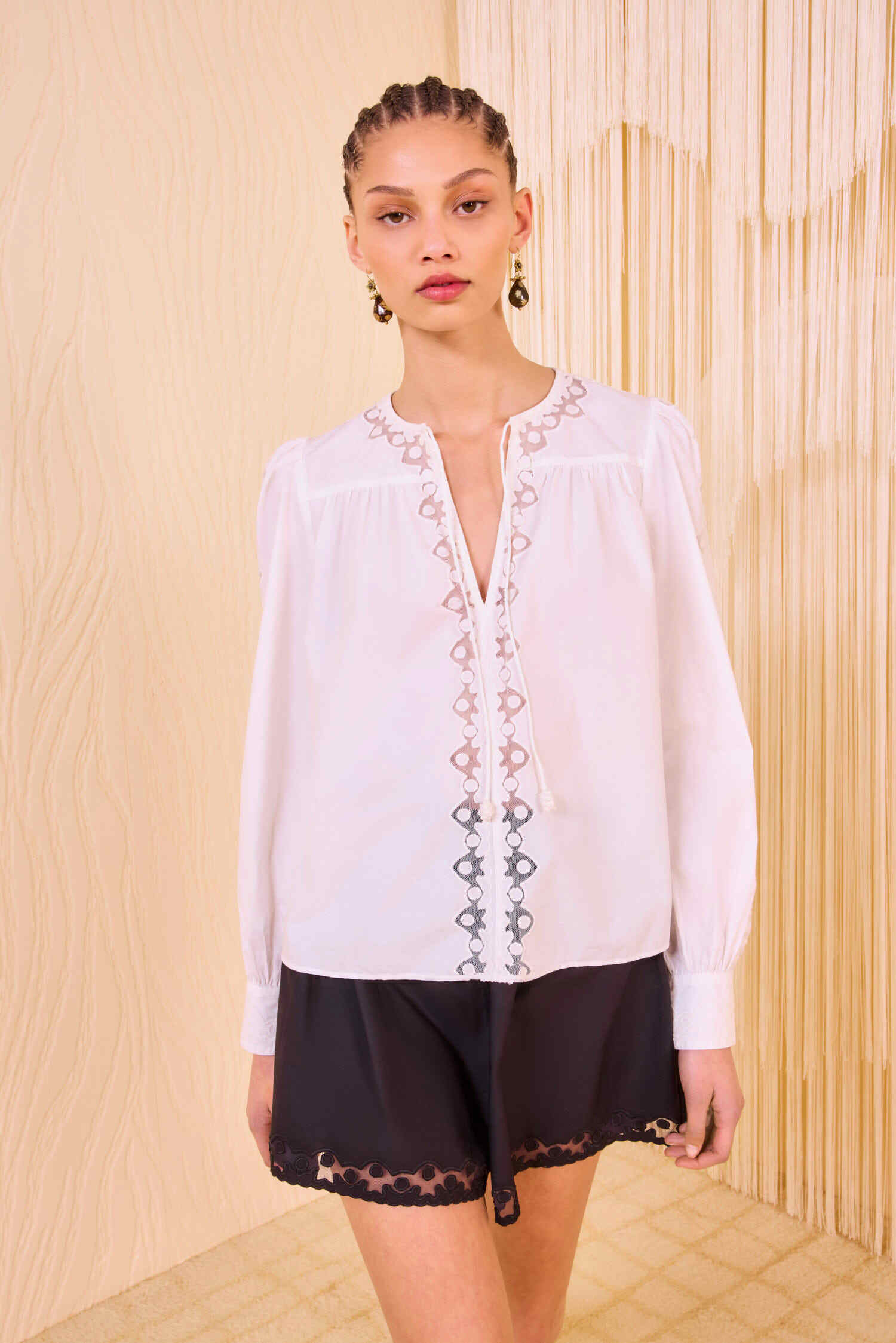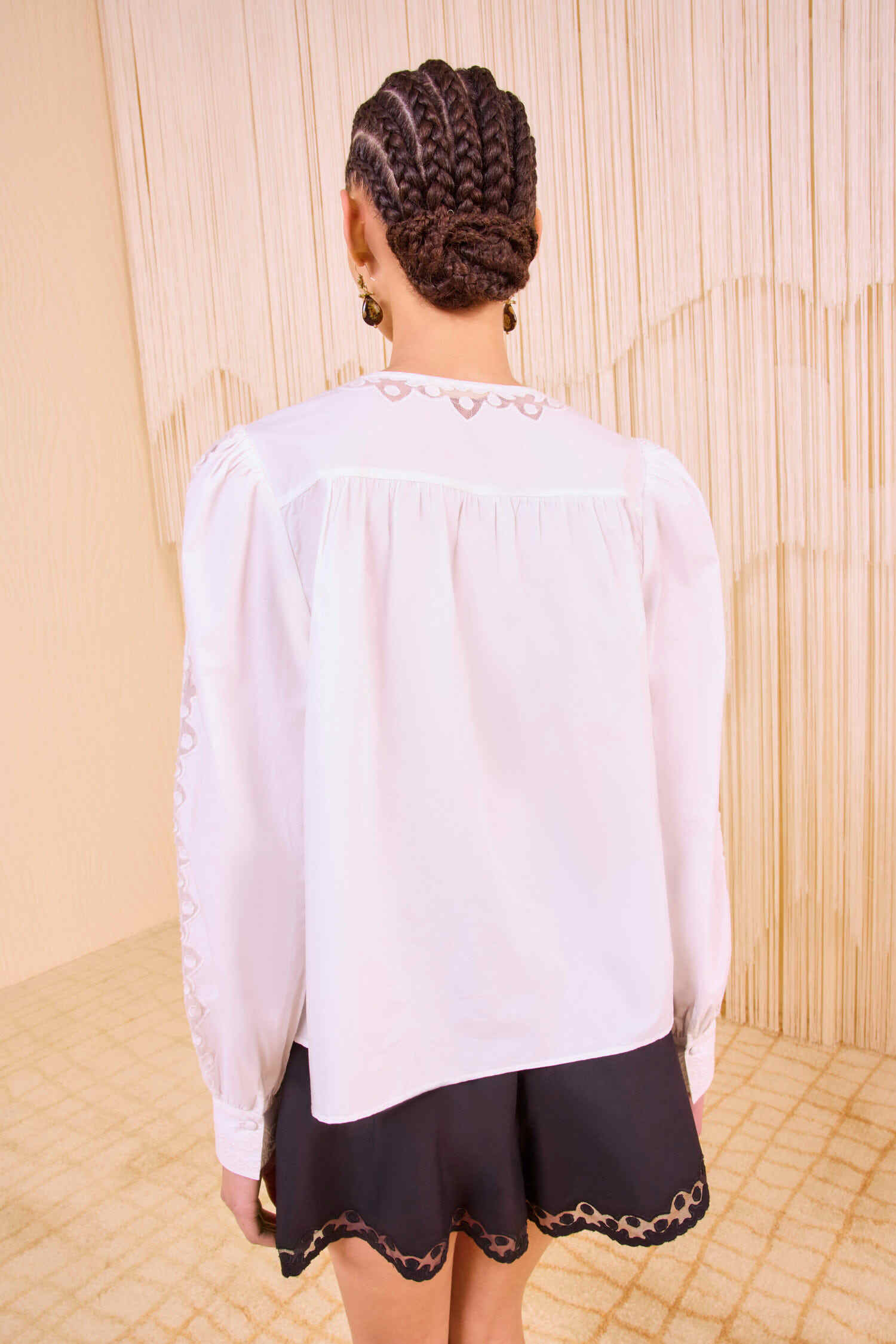 The Kady Blouse is elegantly traced with geometric embroidery and tulle appliqués that create subtle transparency. This white long-sleeve top is crafted from our signature water-washed cotton, with architectural gathers and a loose, effortless fit. Fasten the neckties or leave them undone for a more relaxed look.