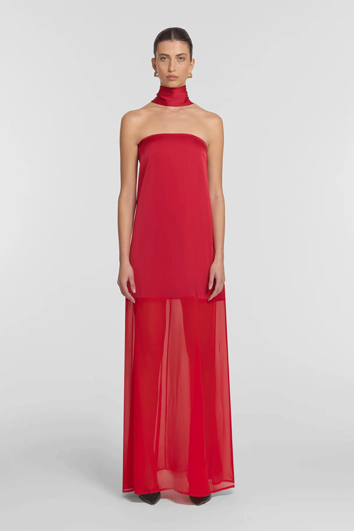Exude effortless confidence in the Loveday Dress, a statement for elevated occasions. Crafted in our signature cupro blend spliced with lightweight silk georgette, the fiery red hue flows with ease. Featuring a structured internal powermesh bustier with boning, it drapes into a soft A-line silhouette with fullness through the sheer skirt and a subtle back split.