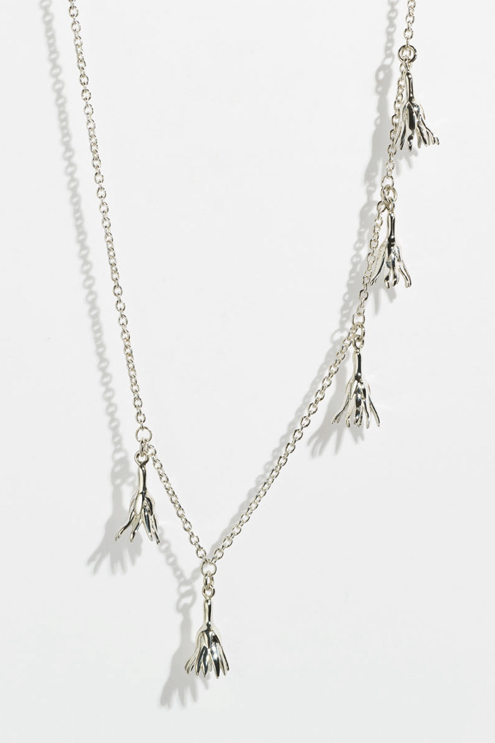 Five delicate, bell-like charms dance from a fine chain, a poetic celebration of growth, transformation, and the eternal rhythm of nature. A statement of quiet strength and beauty.