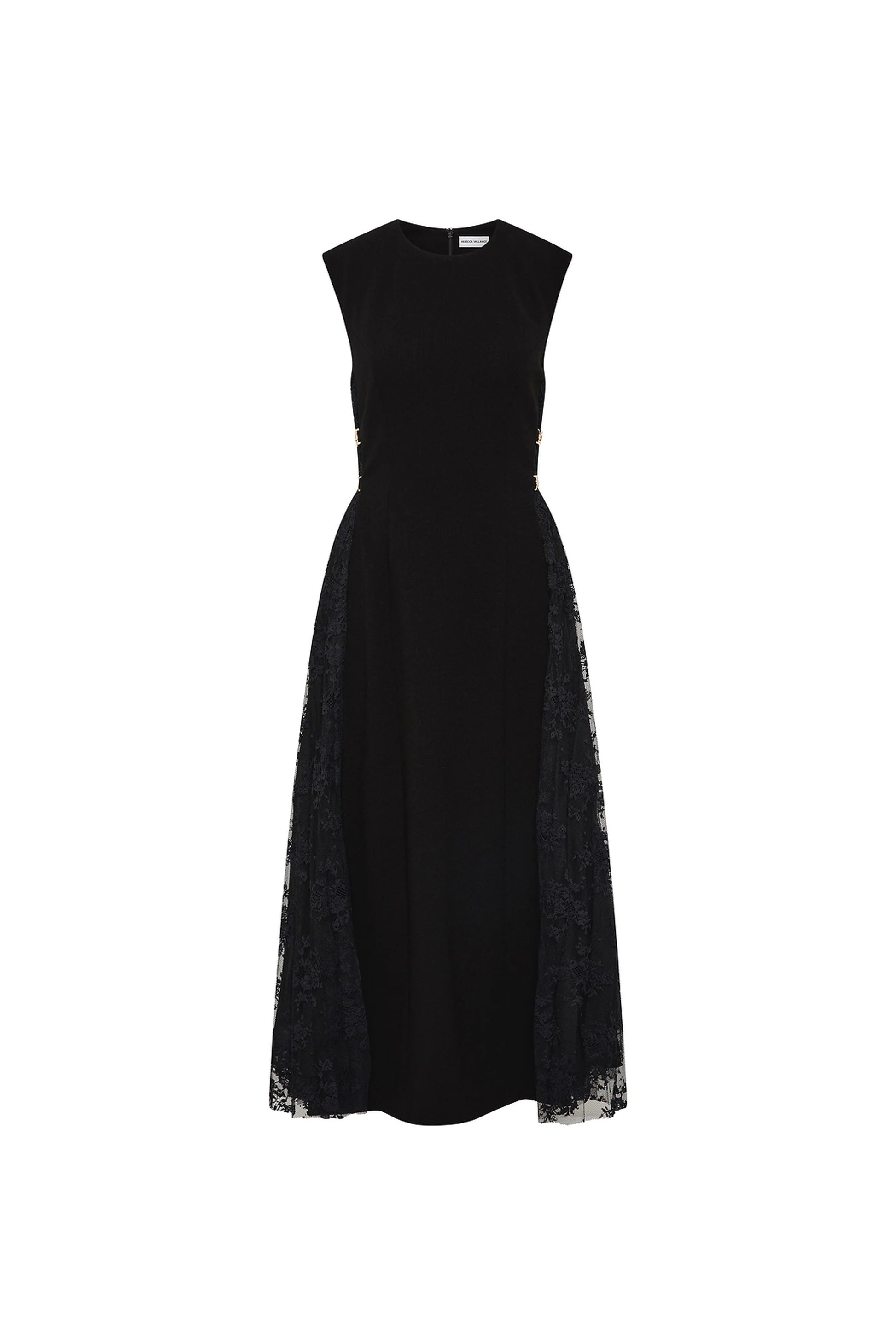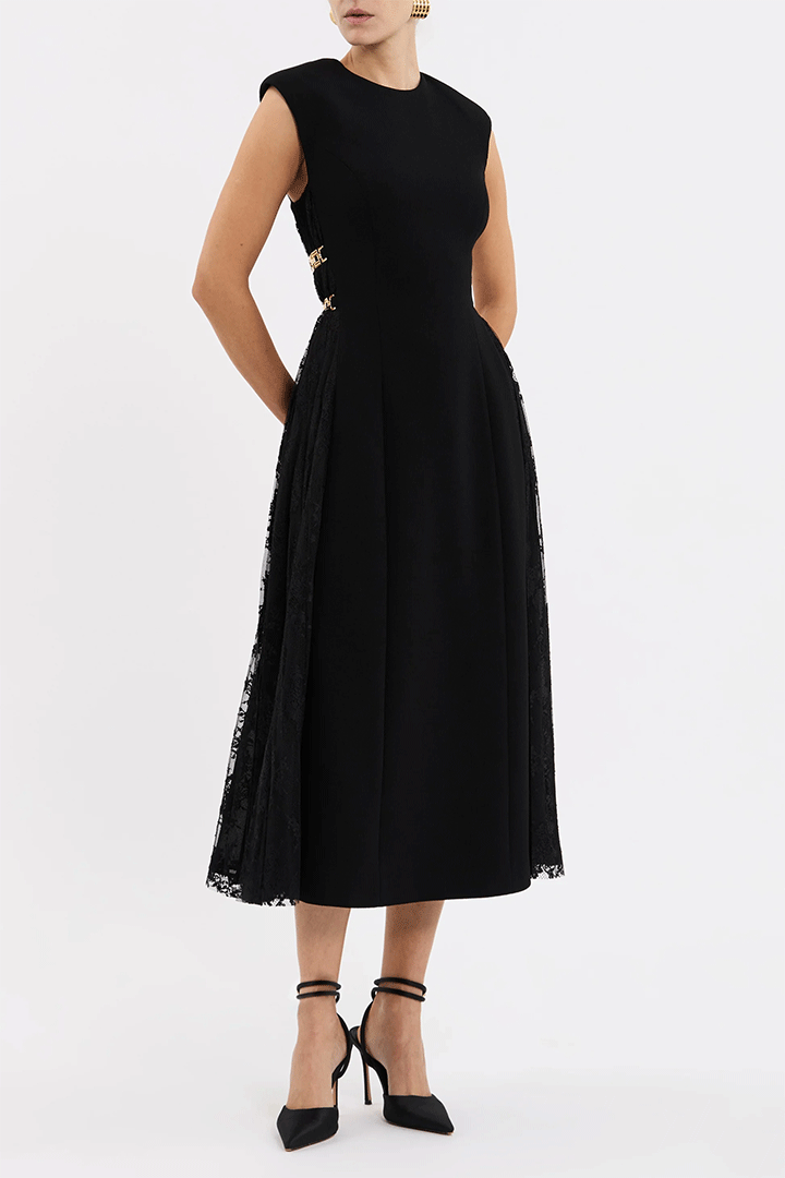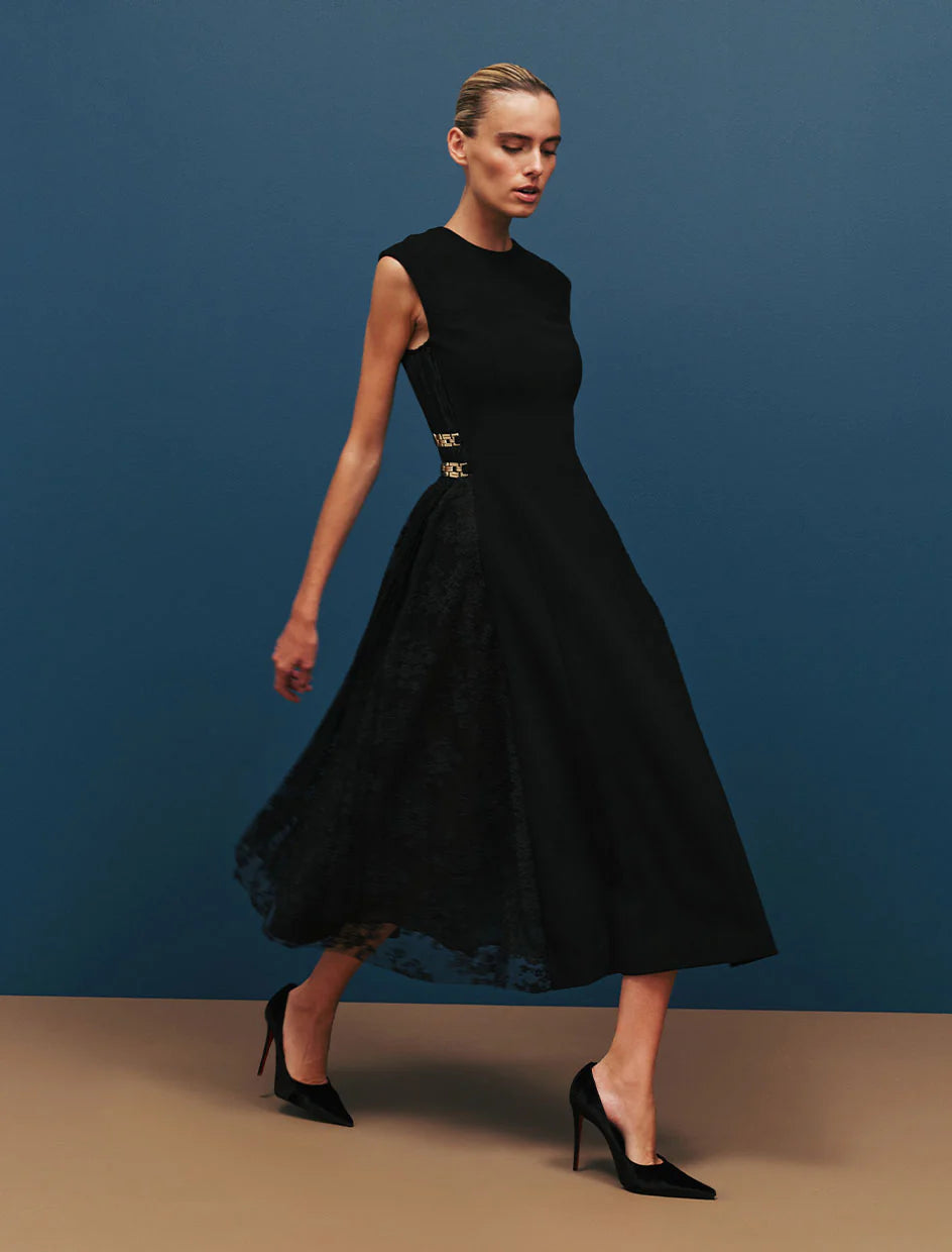 The Milena Midi Dress in black radiates timeless elegance with its enchanting lace panel design. A rounded neckline and sleeveless fitted bodice sculpt a sophisticated silhouette, enhanced by princess seams to flatter the figure. Its circular midi skirt shapes a graceful silhouette, detailed with intricate lace panels and art deco chains at the sides for a touch of opulence. Complete with an invisible zip fastening at the back, this dress is a lovely choice for your next special occasion.