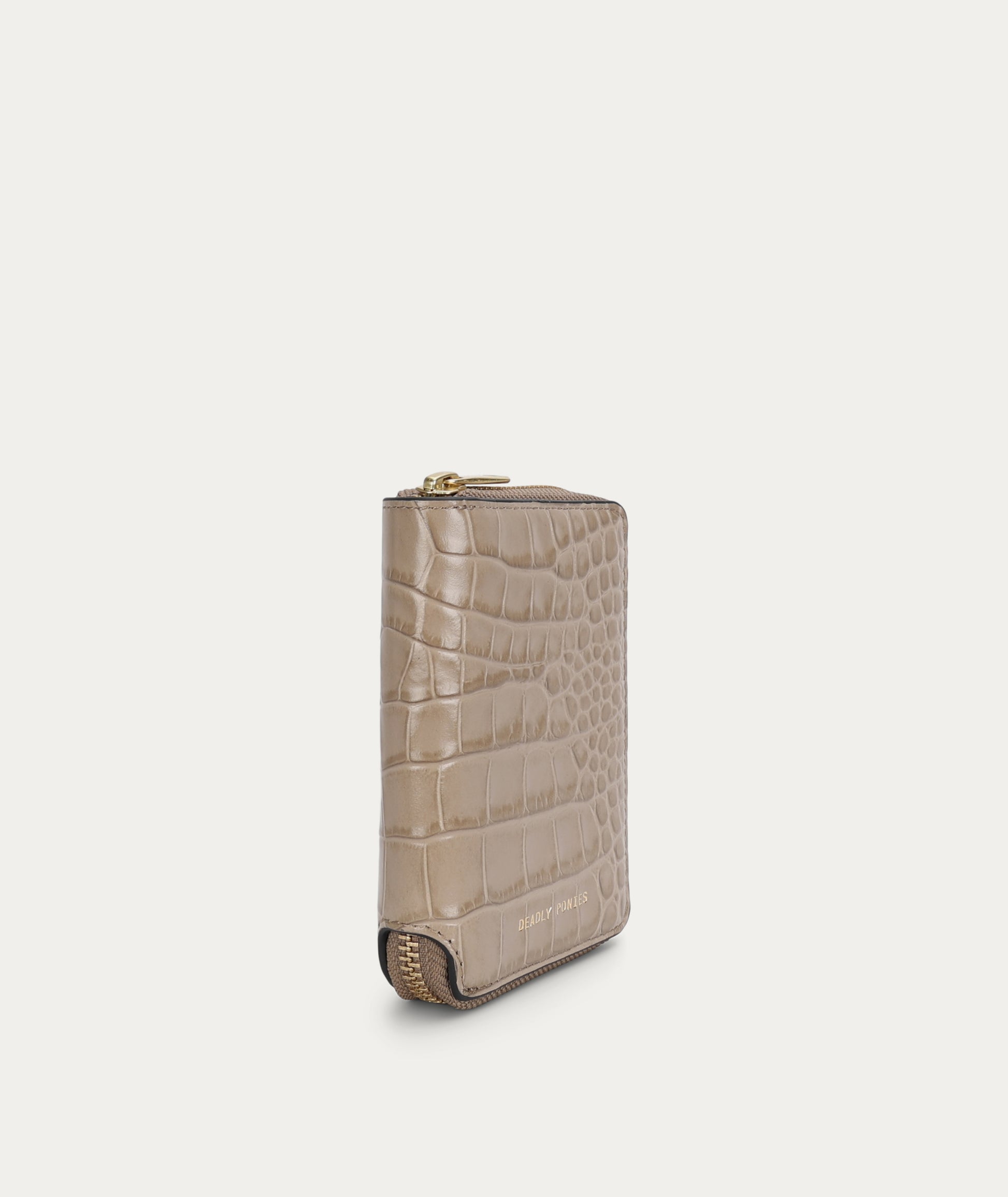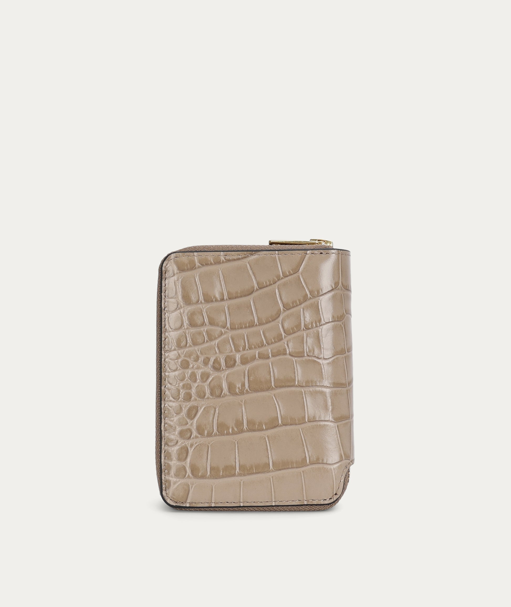Mini Wallet in Oat is crafted from hand-painted Croc-embossed Calf Leather. Slimline yet functional, it features a brass zip closure and holds five card slots, two cash compartments, and a domed coin purse, keeping your essentials secure.