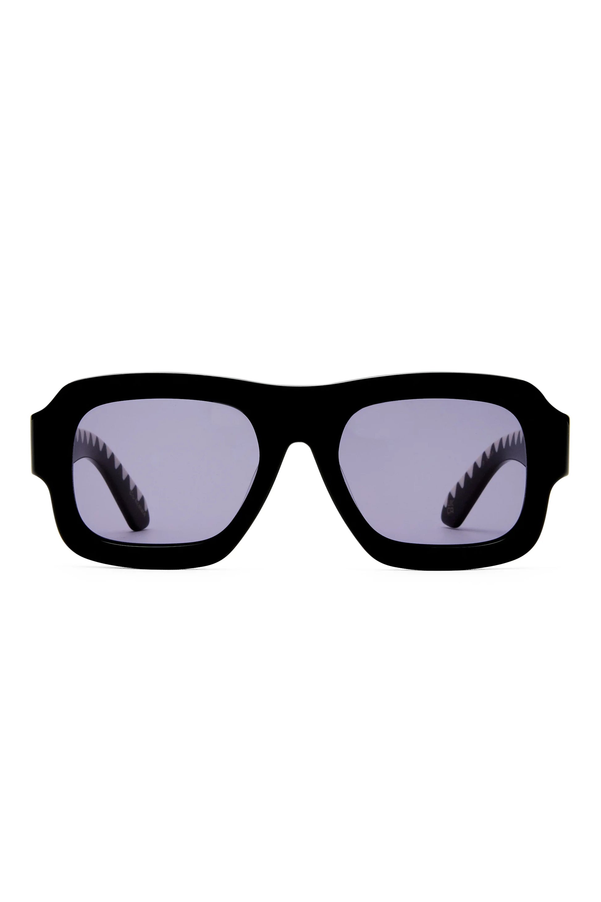 An oversized shield-style sunglass that blends futuristic edge with iconic detailing. Crafted from black bio-acetate and fitted with smoke mono lenses, Moonside is defined by deep forest zig-zag lamination along the temples and finished with signature gold arrow pin rivets.