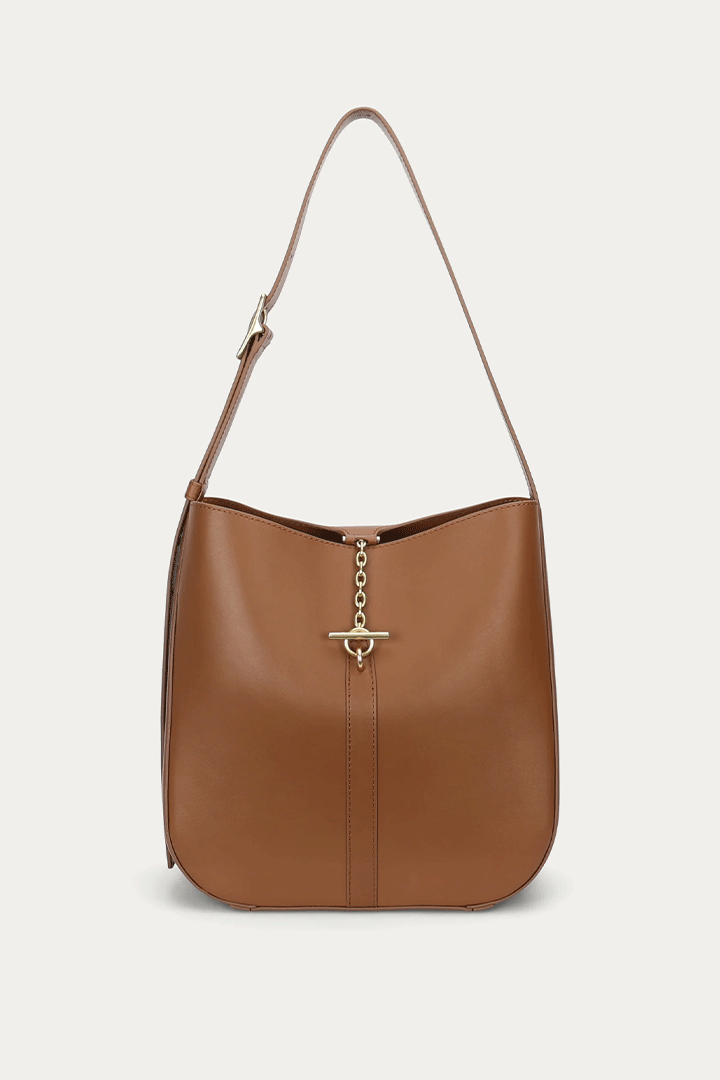 Mr Foldabit in Driftwood is a structured tote, crafted from Calf Nappa with signature brass detailing. He features a chain and T-bar closure, an adjustable strap with a distinctive buckle, and a velvety suede interior with a detachable zip pouch.