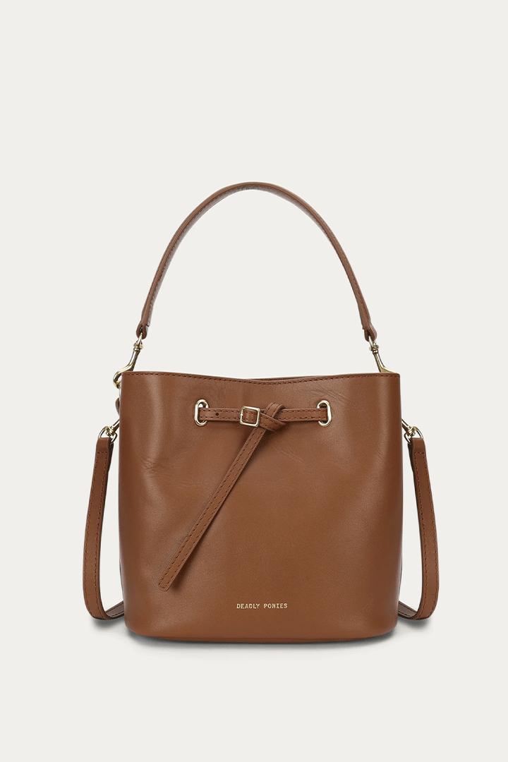 Mr Penny in Driftwood reimagines the classic bucket bag in Ironed Calf Nappa, finished with solid brass hardware. He features leather detailing threaded through brass eyelets, a detachable top handle, an adjustable strap, and a removable cotton pouch.