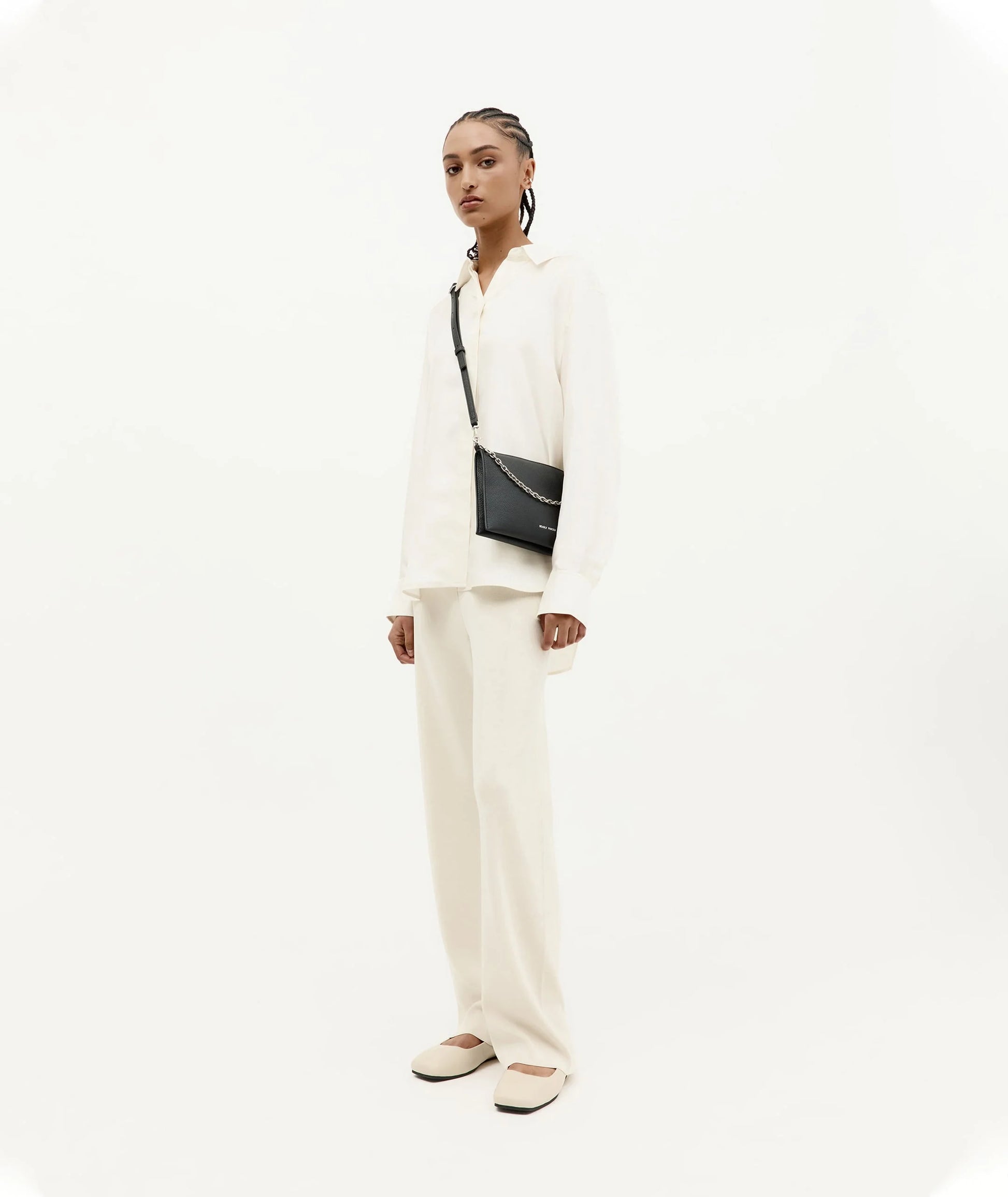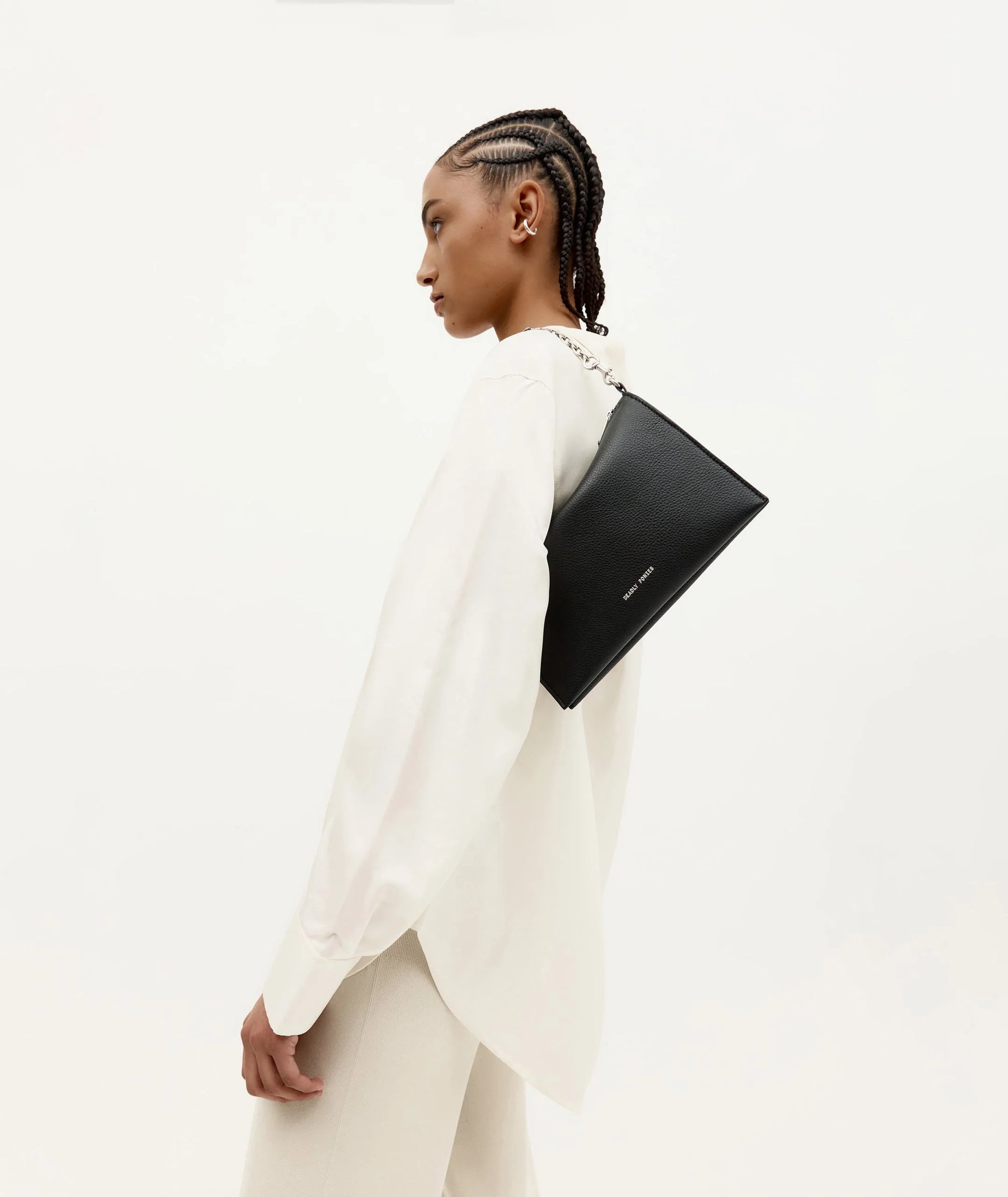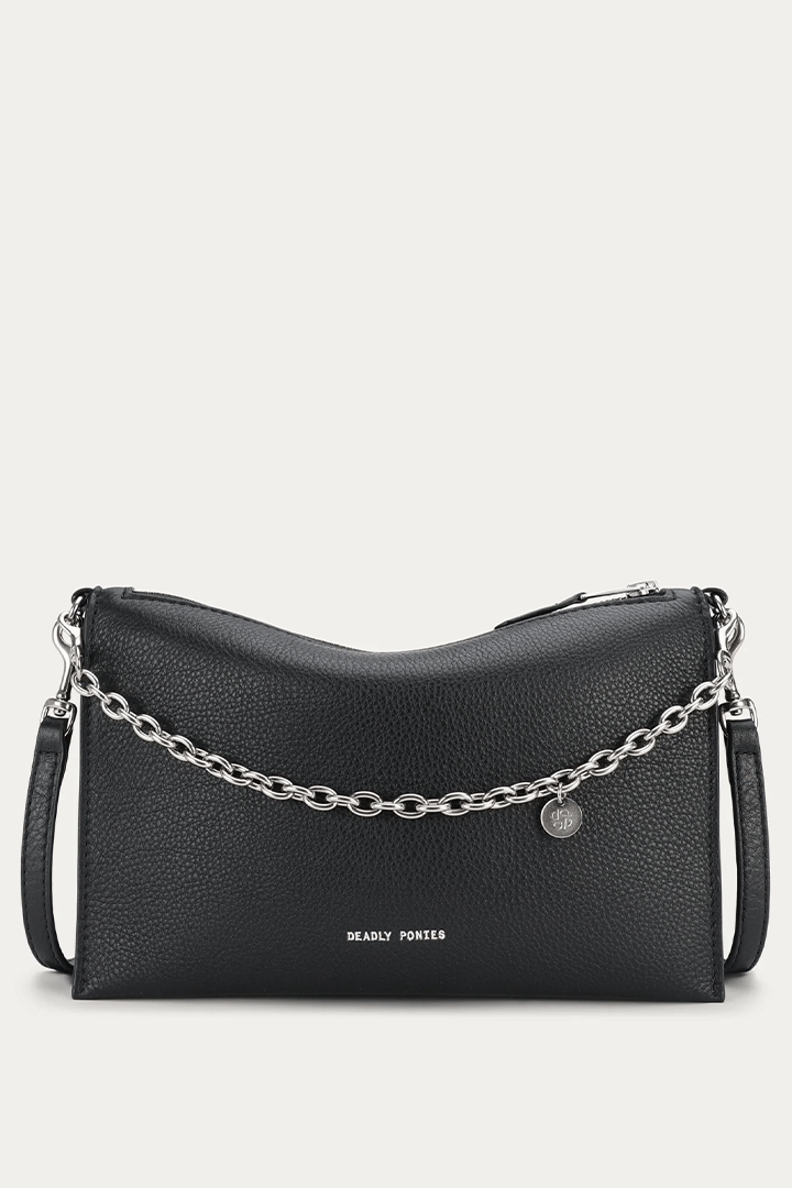 A Deadly Ponies favourite, Mr Siamese is intricately crafted with a single piece of buttery Calf Nappa in Black, folded to form his streamlined silhouette. Featuring a detachable, adjustable crossbody strap and a detachable front-facing silver-finish brass chain; Mr Siamese can be worn as a clutch, on the shoulder, or as a crossbody.