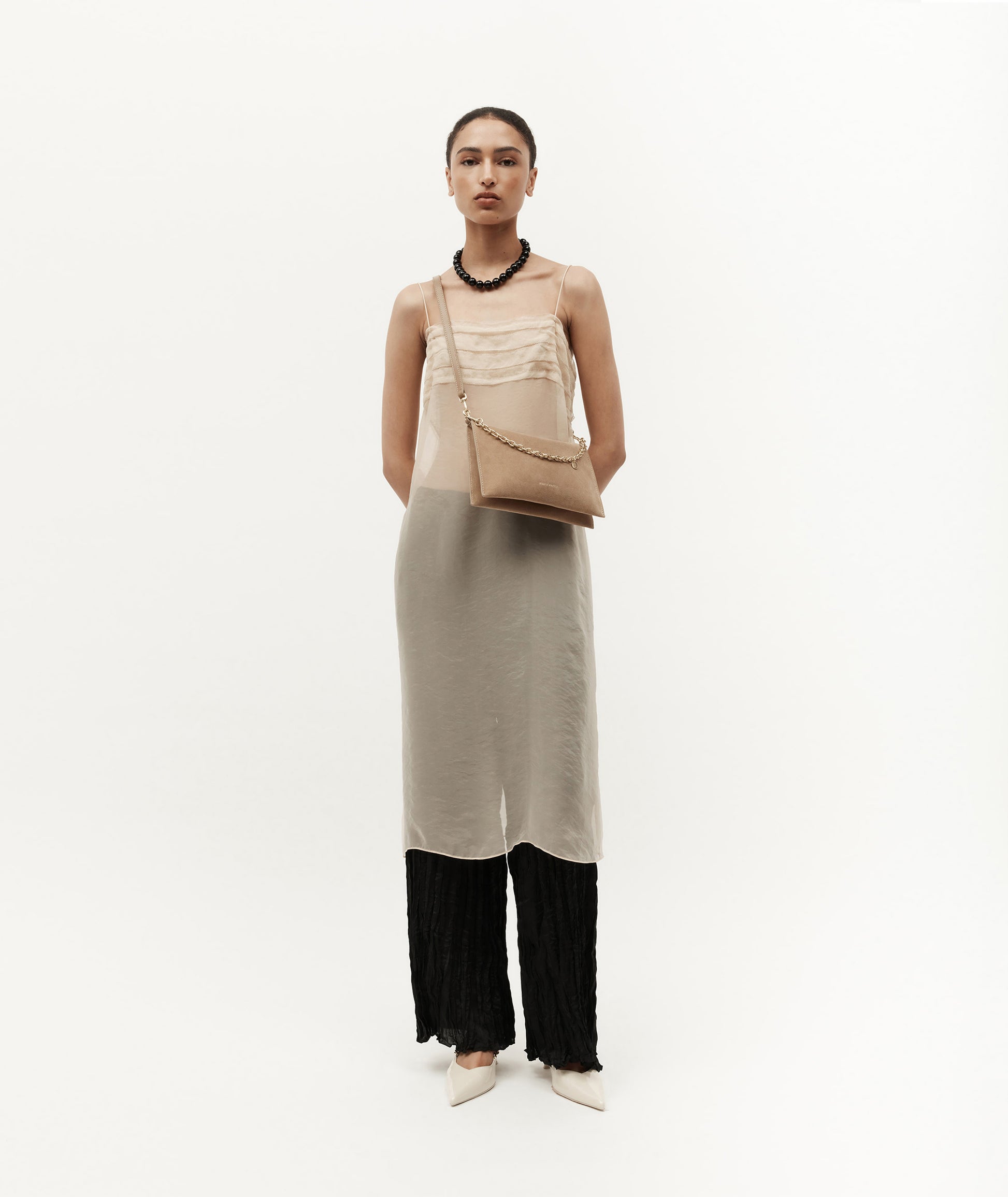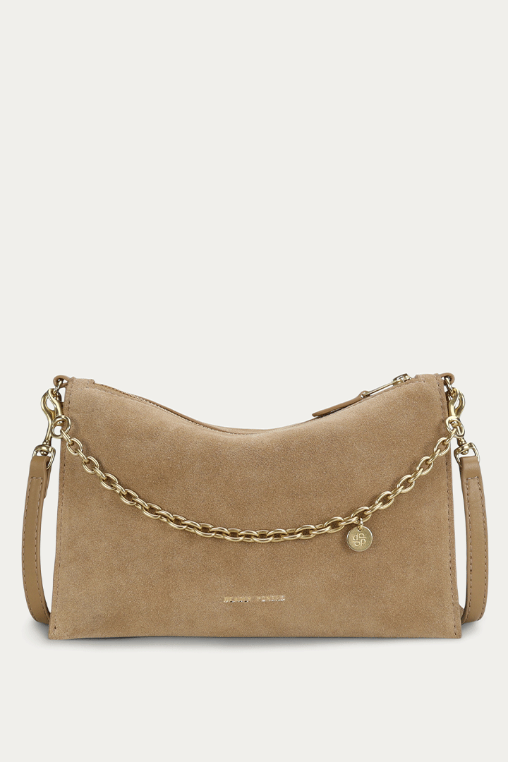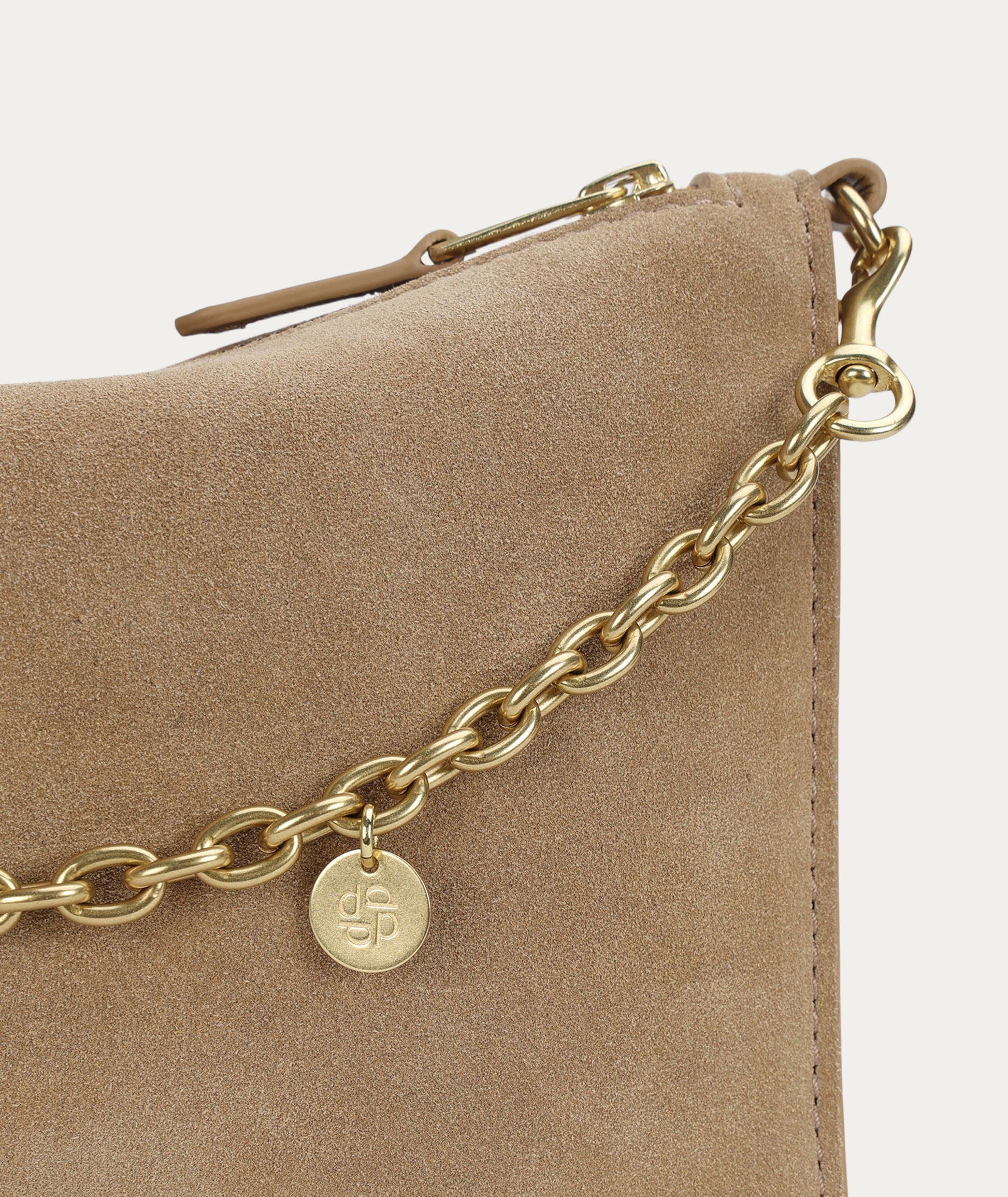 Intricately crafted from a single piece of soft Calf Suede in Oat, Mr Siamese is defined by his streamlined silhouette. With a detachable solid brass chain and adjustable strap, he transitions seamlessly from clutch to shoulder or crossbody wear.