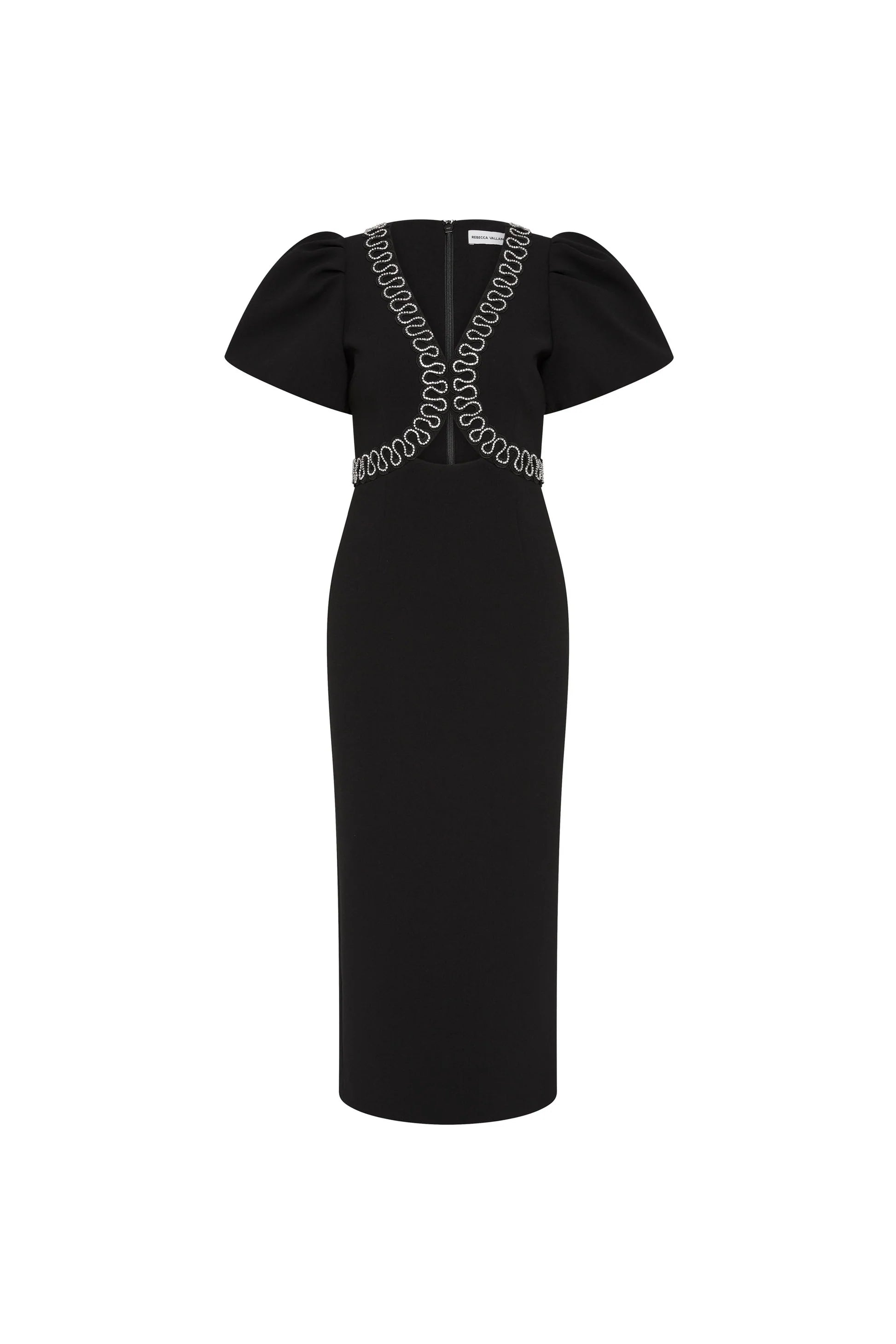 The Nyx Puff Sleeve Midi Dress epitomises timeless elegance infused with modern design. Featuring diamante embellished trim, the fitted bodice with a front cut out and rounded neckline harmonises beautifully with voluminous short puff sleeves, creating a sophisticated silhouette. Cinched at the waist, the pencil midi skirt is enhanced with a back split, adding an alluring touch to the design. Fully lined and secured with a zip fastening at the back, this polished dress is a chic choice for your next special occasion.