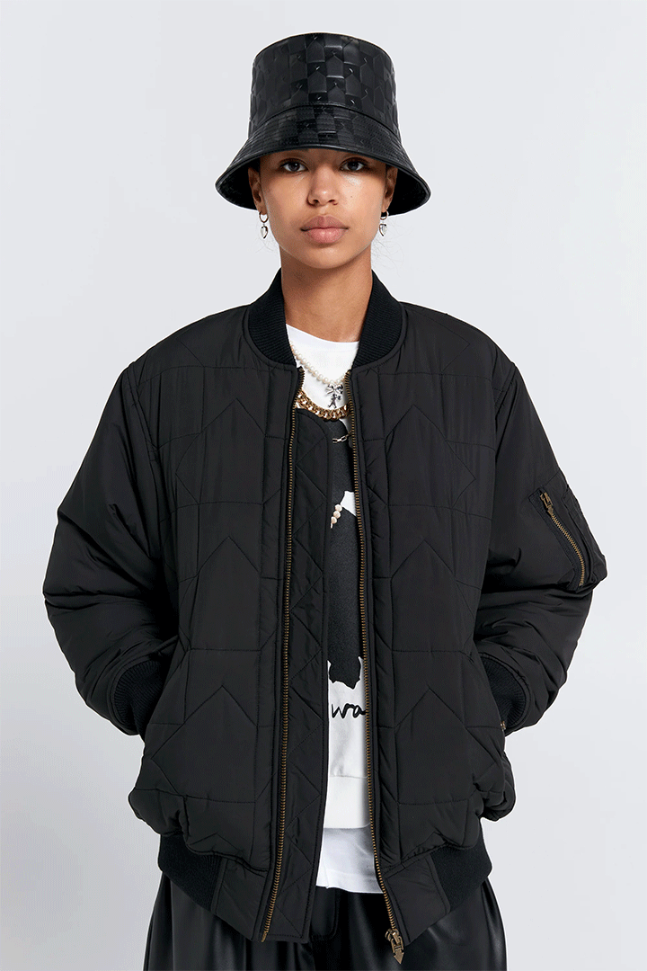 The Quilted Bomber Jacket reimagines a classic silhouette with KW charm, crafted from puffy monogram quilting. It’s detailed with two front snap-closure pockets and a zip pocket on the sleeve and finished with the Runaway Girl patch on the back. Ribbed cuffs and hem provide a structured shape to the relaxed fit.