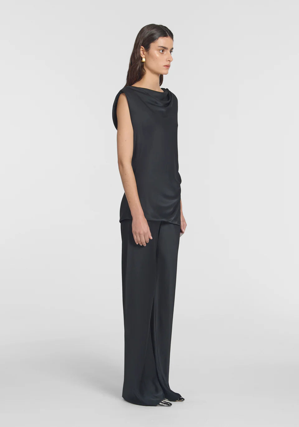 Radiating elegant simplicity, the Revere Top is crafted in classic black. Cut on the bias for a fluid drape, it features a cowl neckline, extended shoulders with removable pads, asymmetric seaming and a side split. Pair with the matching Atlantis Pant for an effortless silky set that embodies fluid elegance and considered proportions.