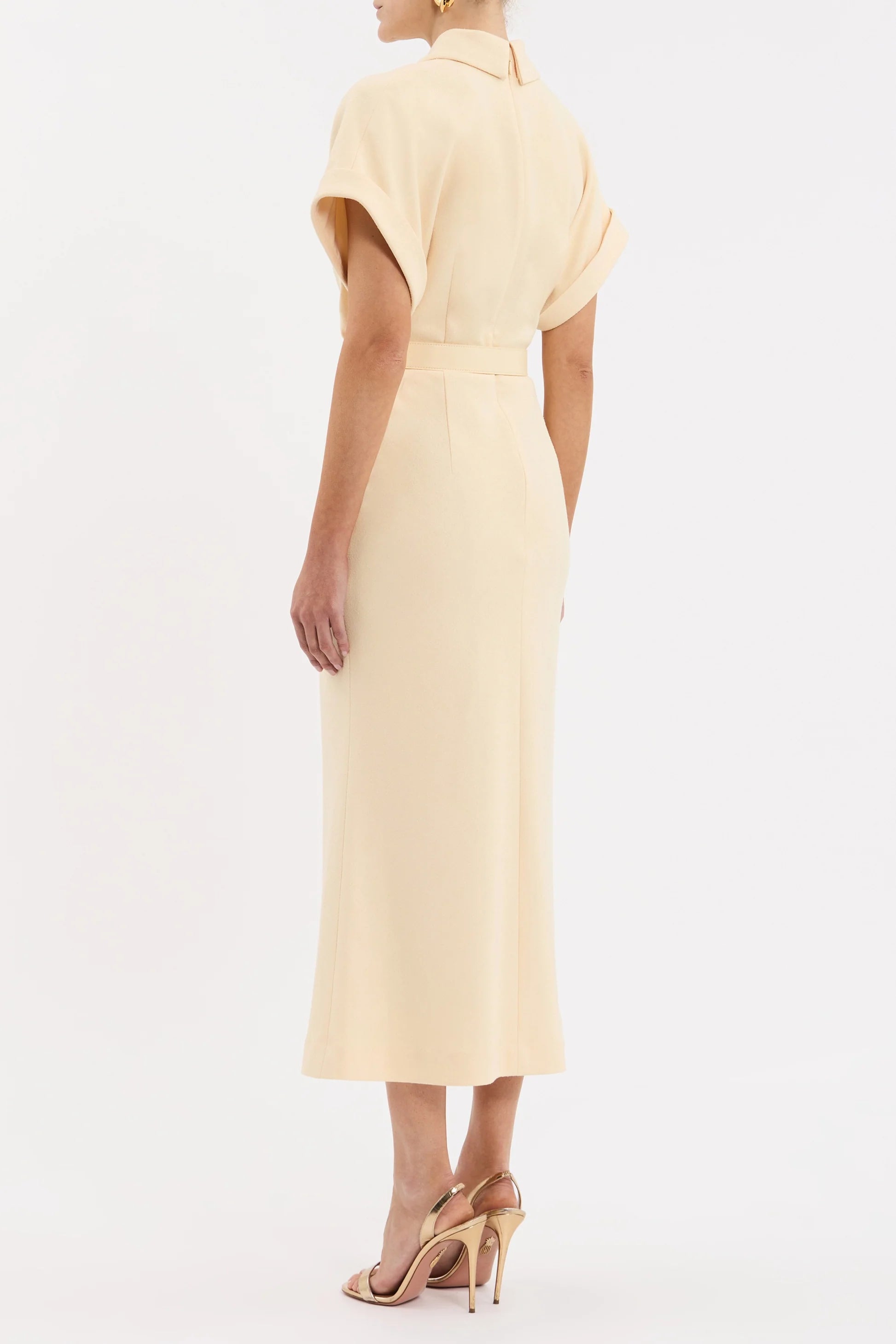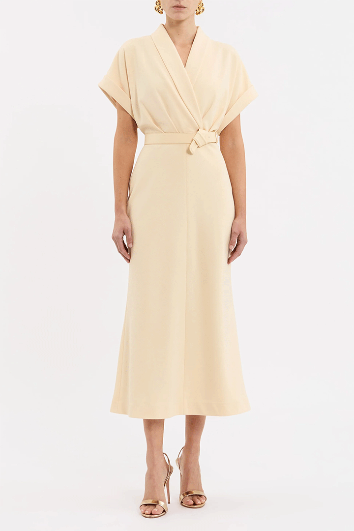 The Rowan Midi Dress epitomises refined elegance in a soft butter-yellow hue. Featuring a chic wrap-style bodice, its V neckline and grown on sleeves shape a sophisticated silhouette, cinched at the waist with a self-belt. The bias-cut midi skirt enhances the flattering fit, exuding effortless grace. Perfect for both day and night, this dress is a beautiful choice for your next special occasion.