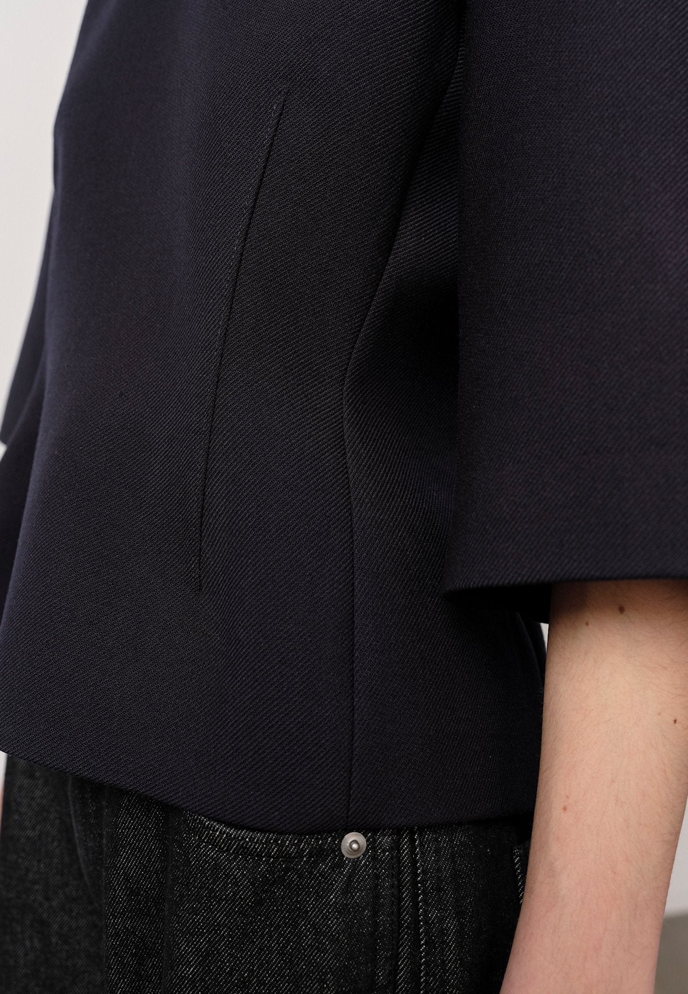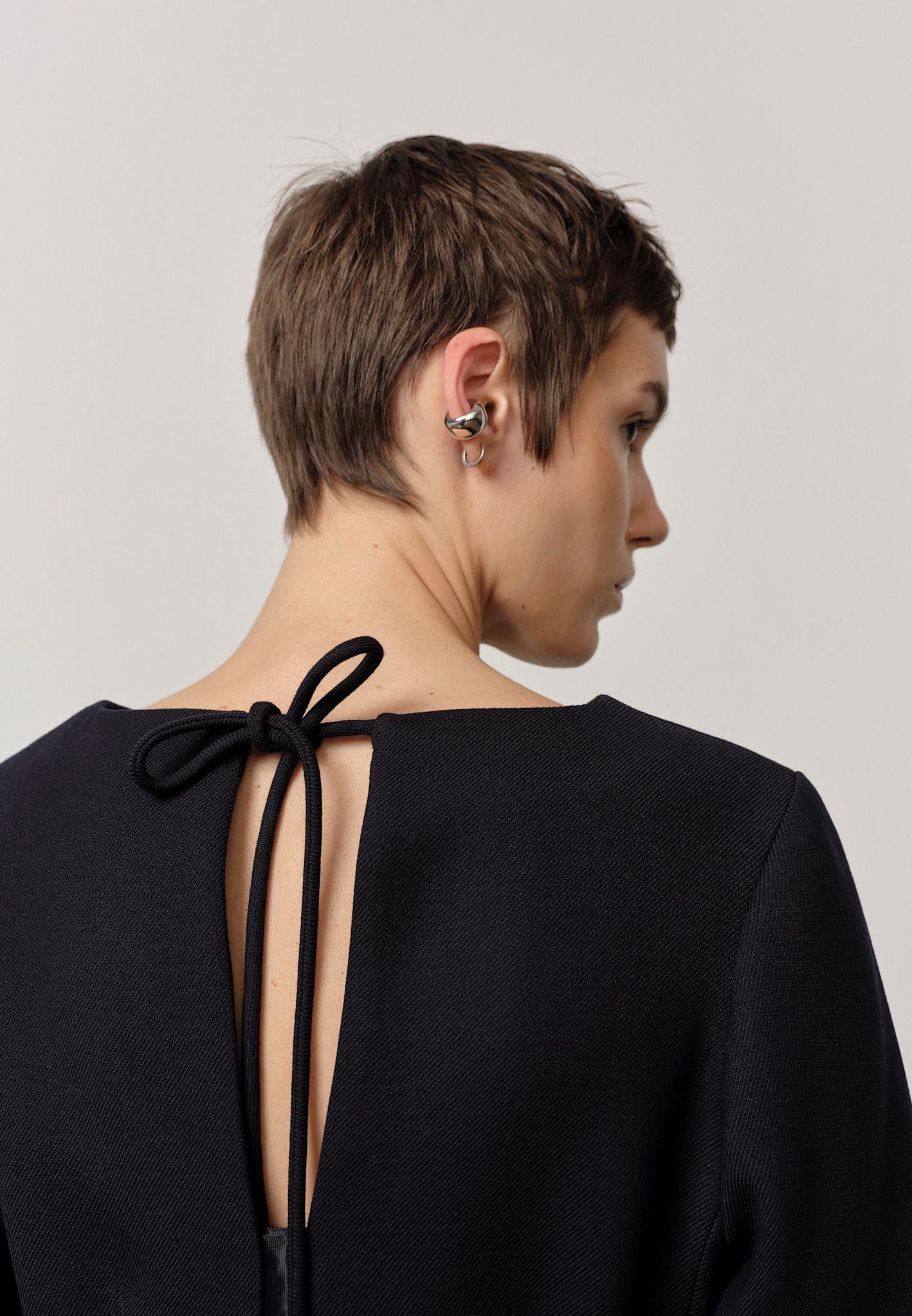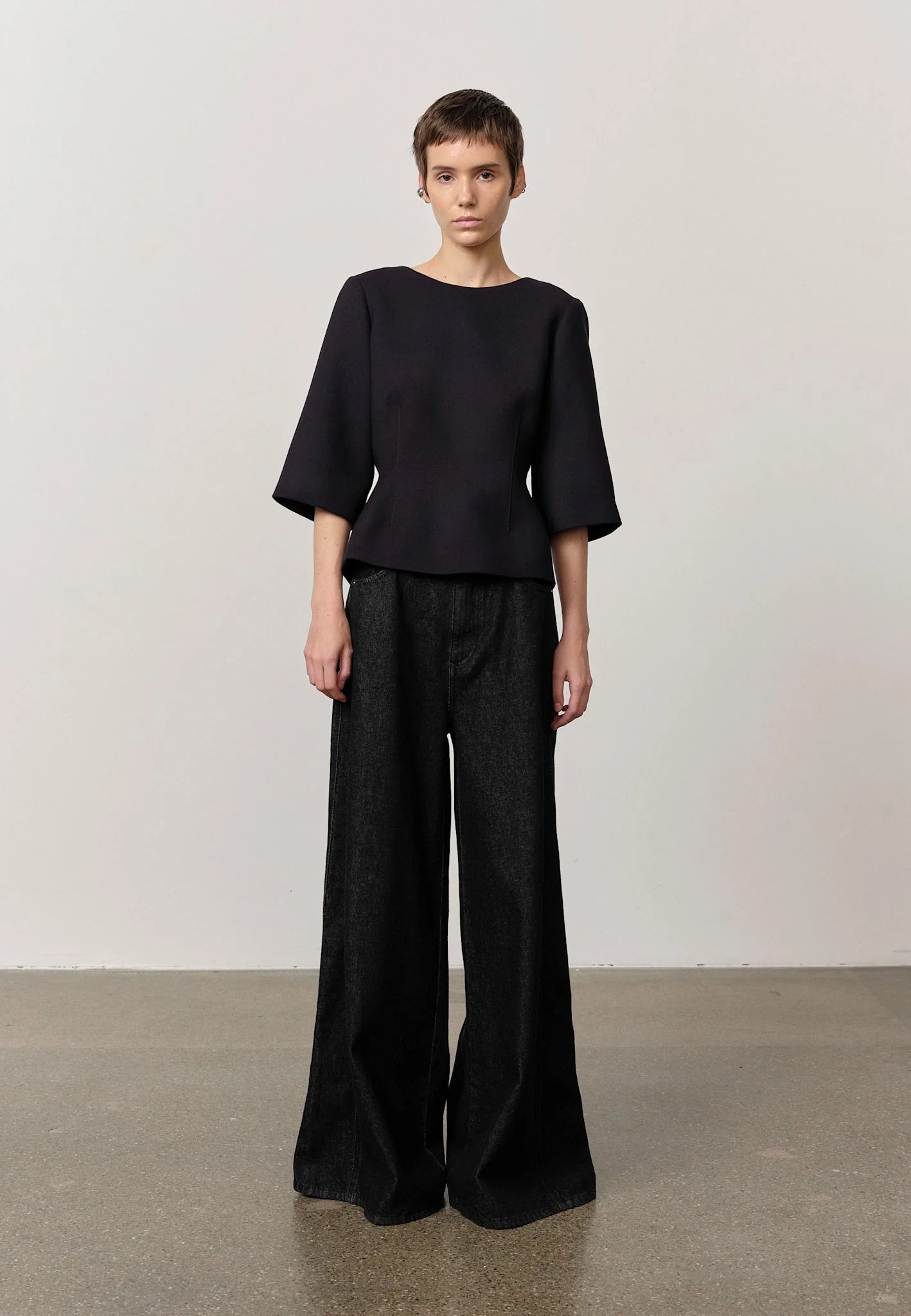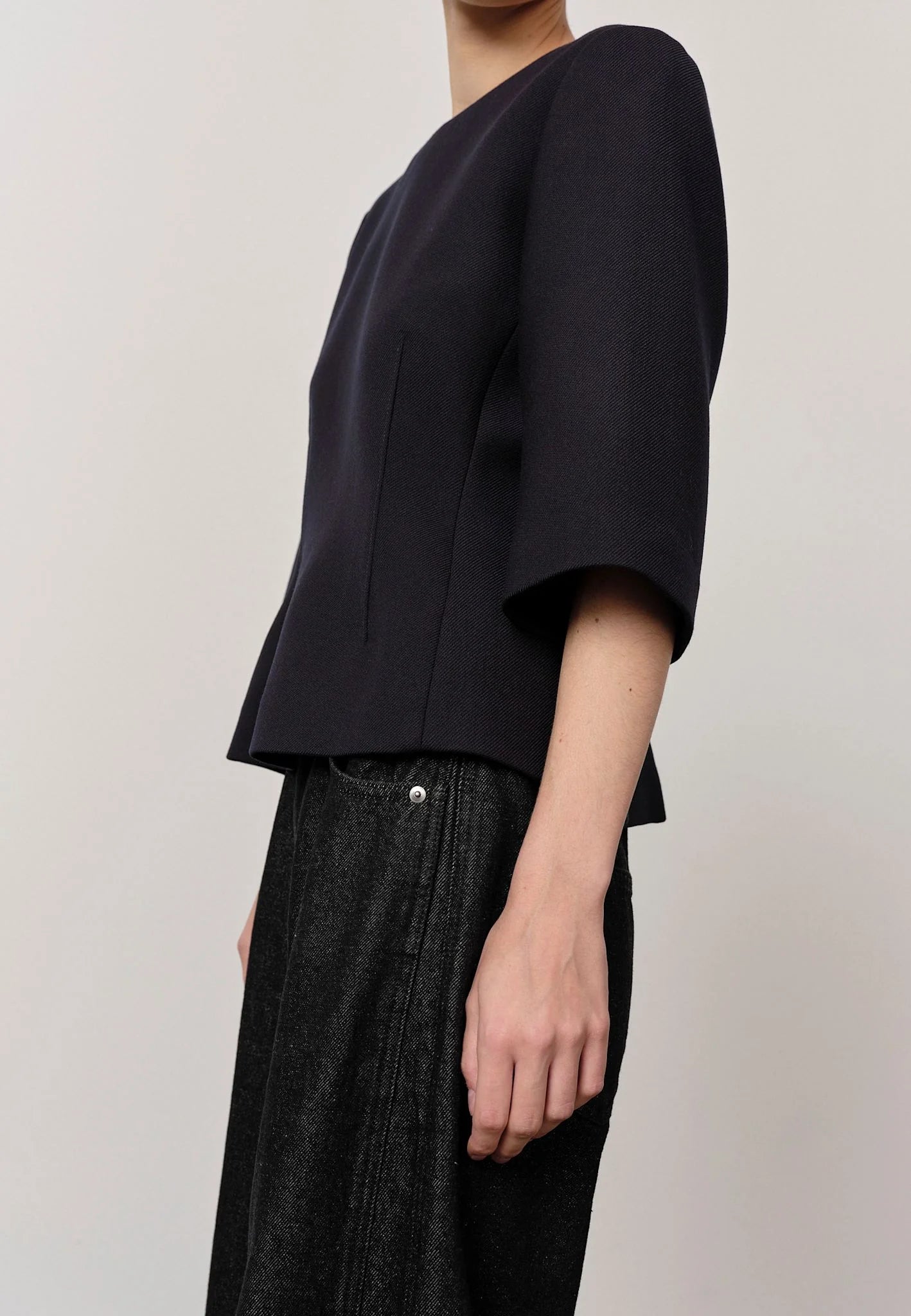 Introducing the Samuel Blouse: A structured top with cropped sleeves and long waist darts for a tailored silhouette, featuring an open back with a neck tie and bra-style closure.