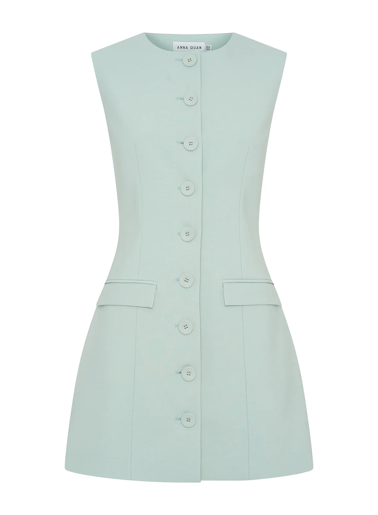 The Sofia Dress in Acqua is cut in a seasonless lightweight wool blend made for endless wardrobe rotation. A sleeveless tailored mini dress completed with a high round neckline, and waist defining lines. Detailed with self covered buttons, flap pockets and complete lining. Style with flats for daytime lunches or heels for evening events