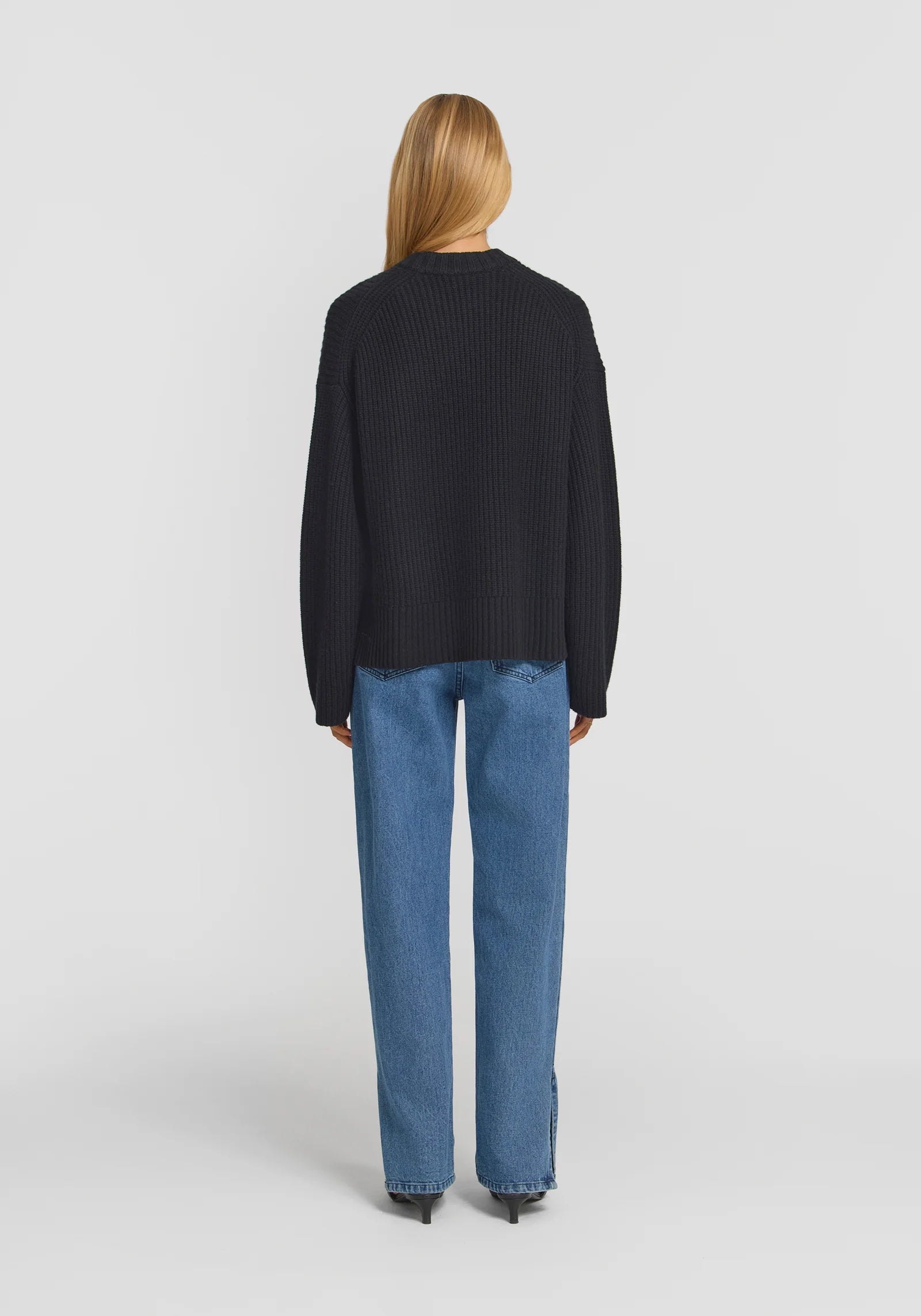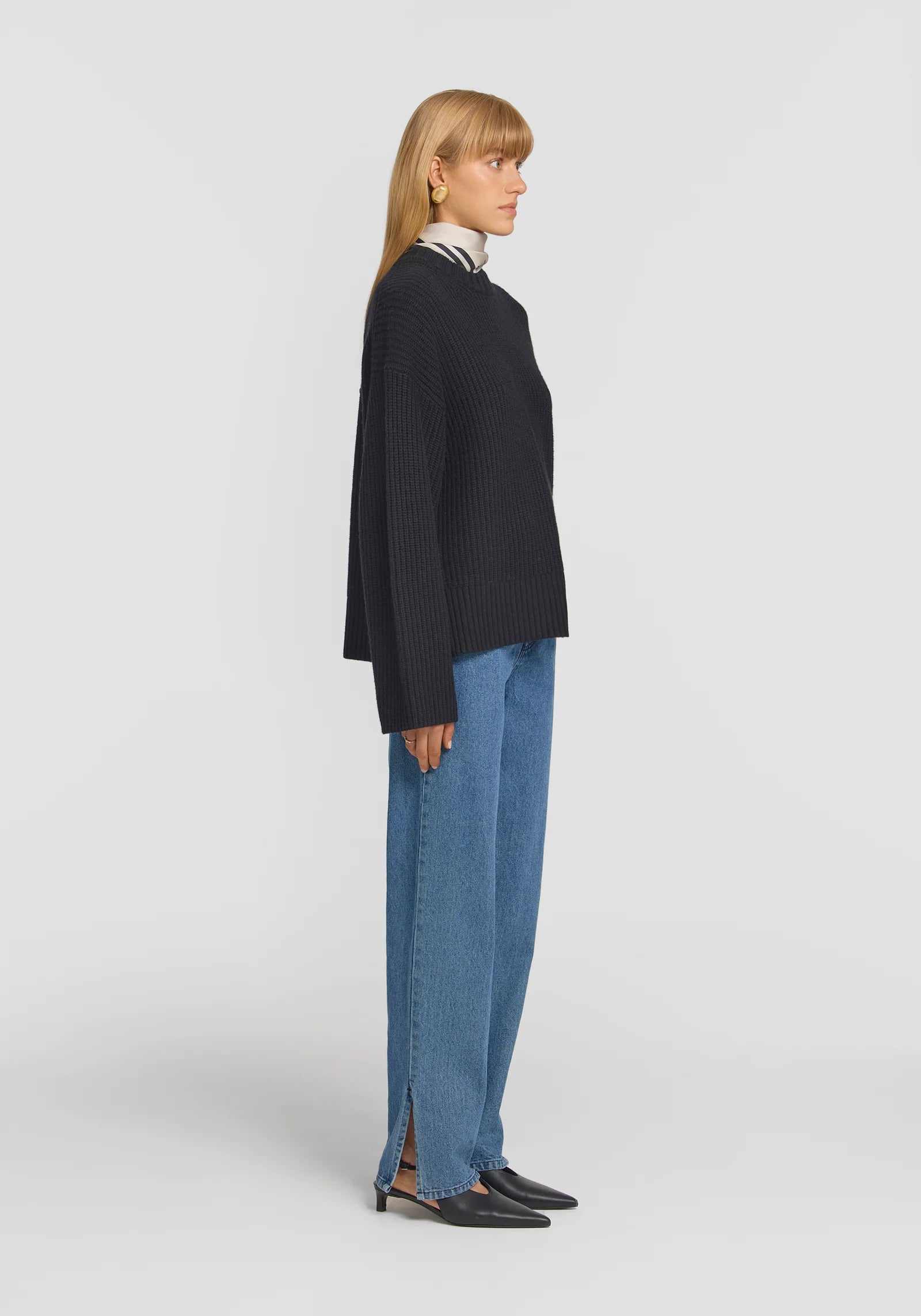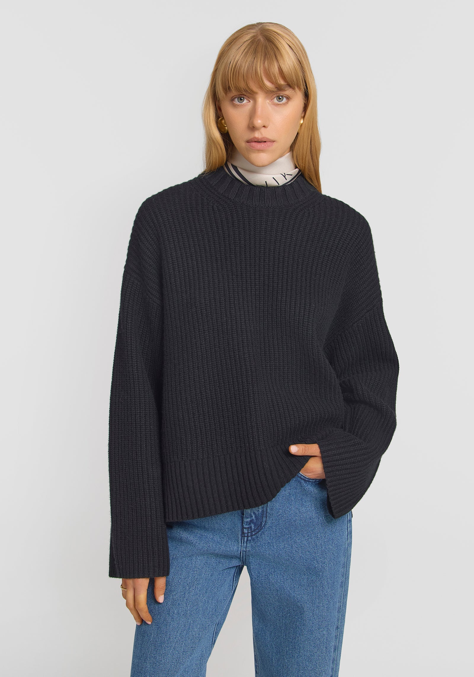A knitwear essential, the Sydney Knit is crafted from a luxurious black wool-cashmere blend. Featuring a dropped shoulder design, fashioning detail around the neck, and a tubular ribbed neck band and hem, this piece is a guaranteed staple for your winter capsule wardrobe.