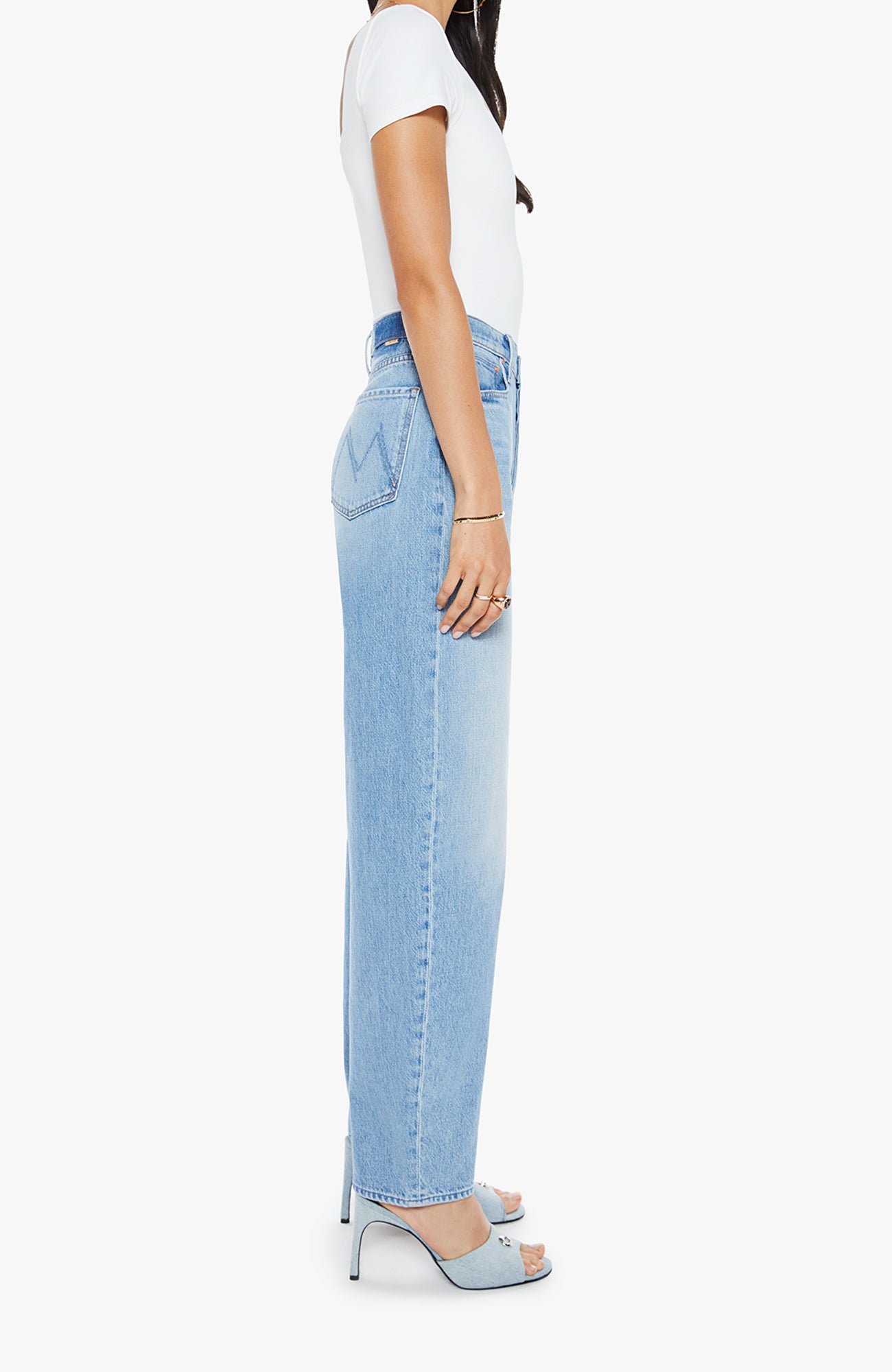 Groovy. High-waisted jeans with a wide barrel leg, button fly and a 31-inch inseam with a clean hem. Made from rigid SUPERIOR denim, Funk N' Flair is a mid-blue wash with whiskering and fading at the knee.