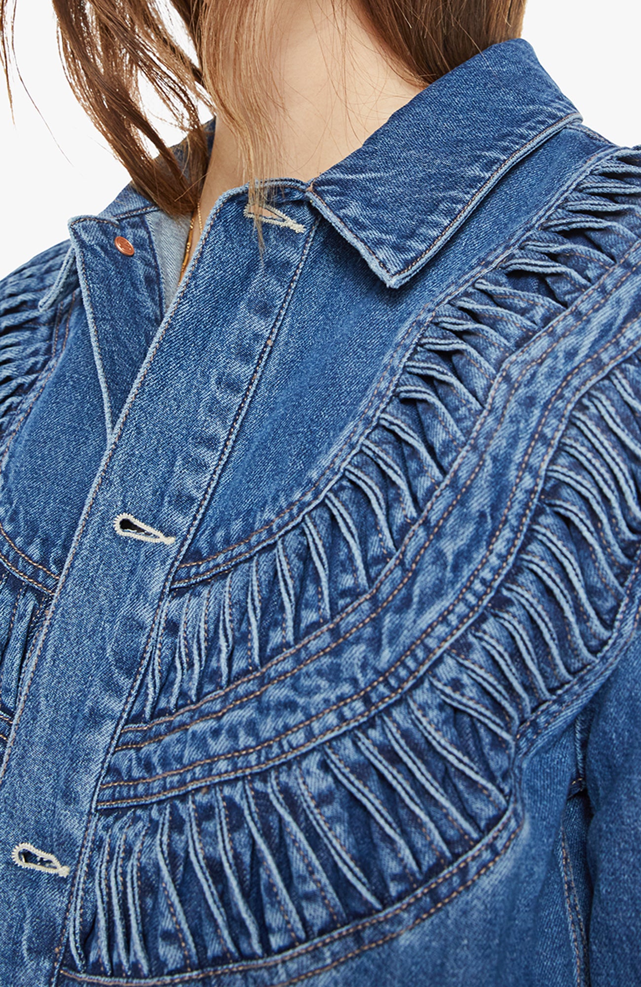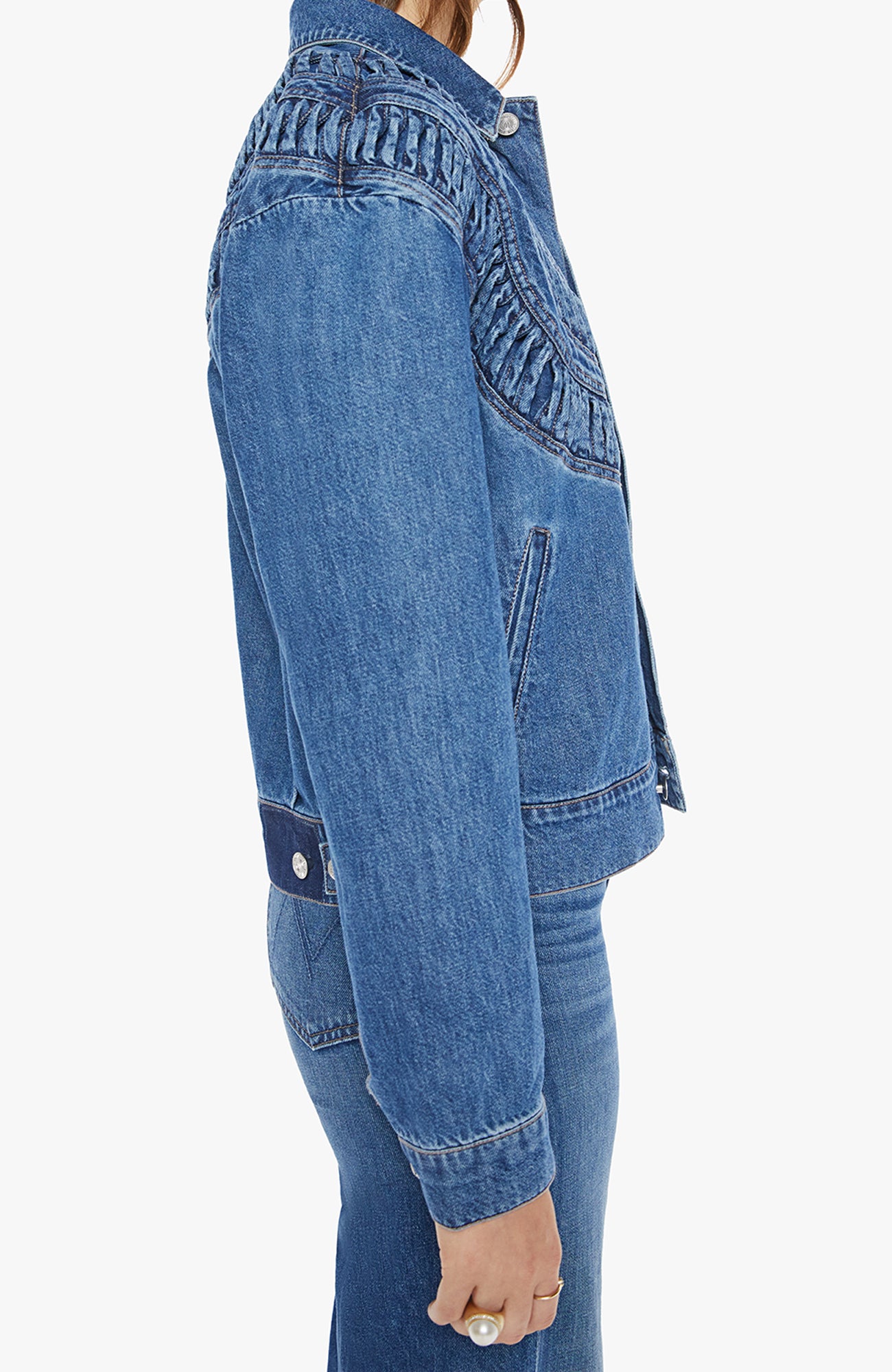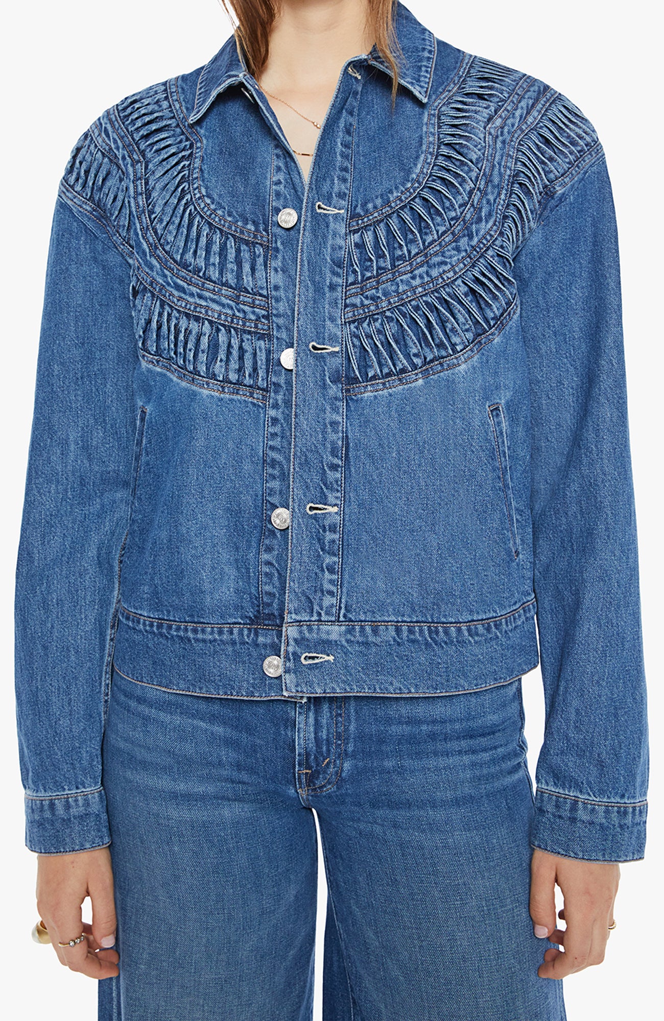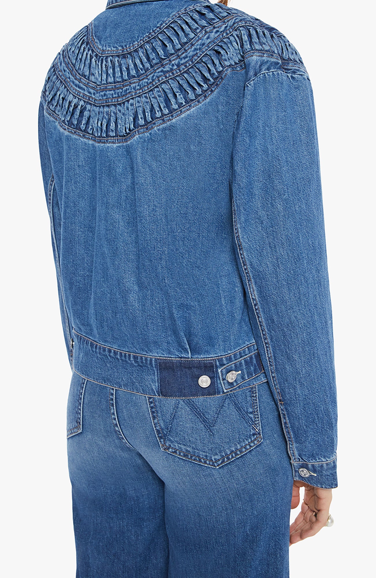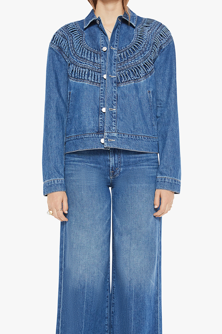 Glow up. A denim jacket with a smocked, detailed yoke, side slit pockets and a slightly cropped hem. Made from rigid SUPERIOR denim, Rags To Riches is a mid-blue wash with subtle fading throughout.