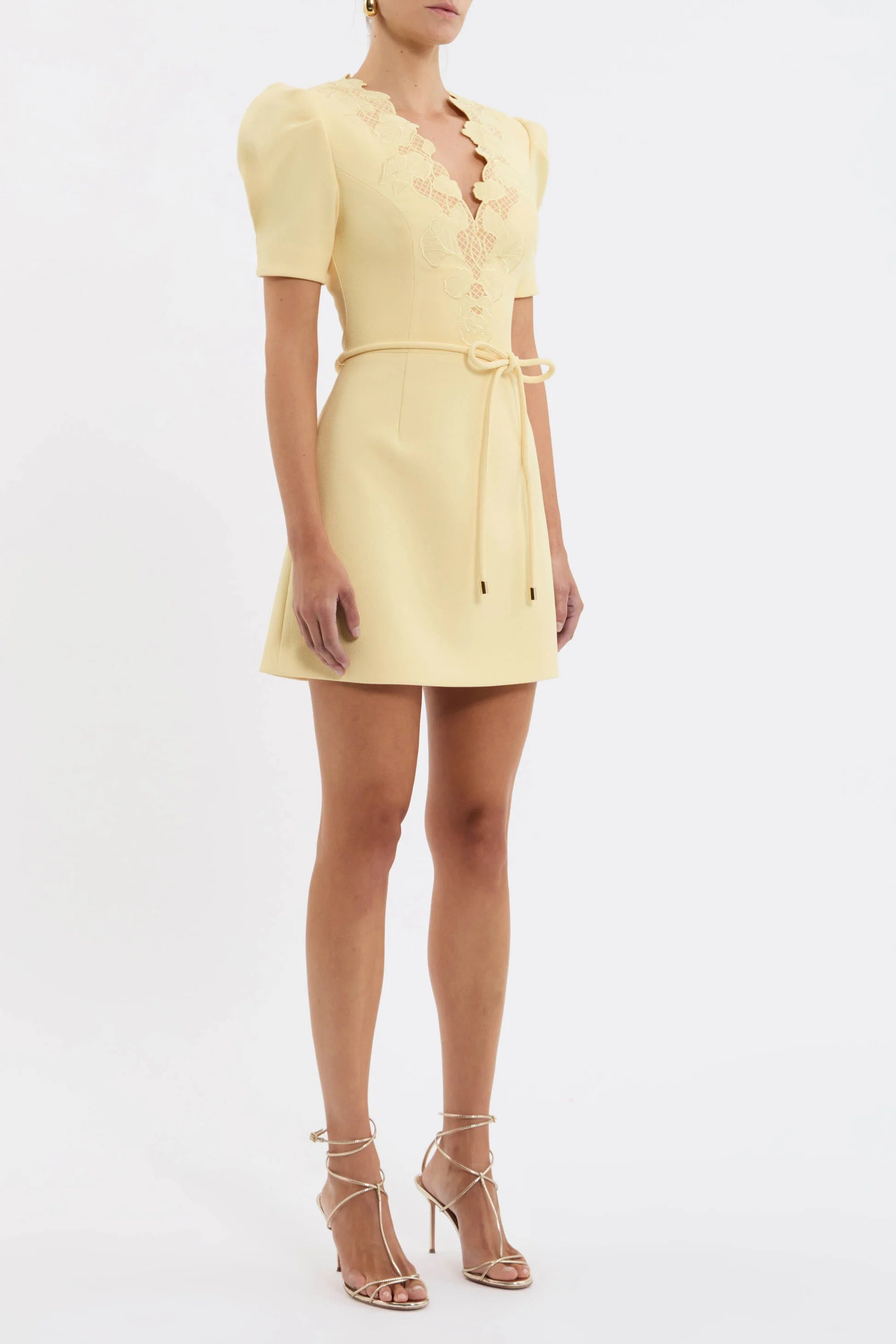 The Lulu Short Sleeve Mini Dress radiates playful elegance in a captivating yellow hue. The fitted bodice and short puff sleeves shape a chic silhouette, while the V neckline adorned with lace trim adds an alluring touch to the design. Cinched at the waist, the A-line mini skirt is complemented by a rope belt that flatters the figure. Complete with lining and secured with a zip fastening at the back, this dress perfectly blends comfort and style.