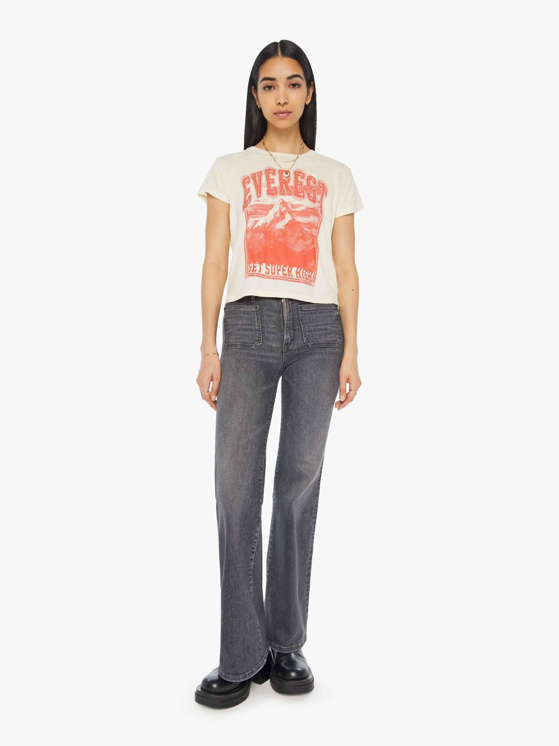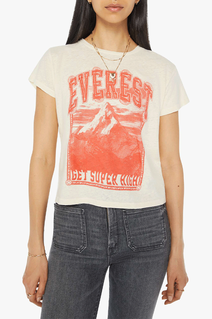On top of the world. A soft crewneck with a slim fit for a vintage look and feel. Made from a SUPERIOR blend of cotton and linen in cream, the Sinful in Get Super High features a faded red graphic of Mount Everest on the front.