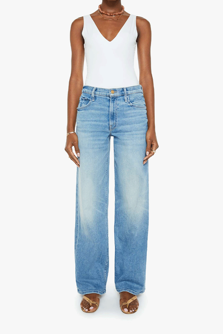 Sunkissed. Slouchy, high-waisted jeans with a loose wide leg and a long 32-inch inseam with a clean hem. Cut from stretch denim, Glow Up is a light blue with whiskering and fading.