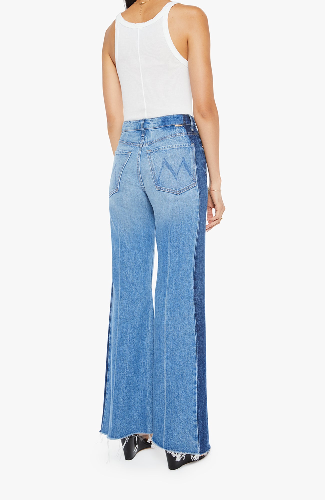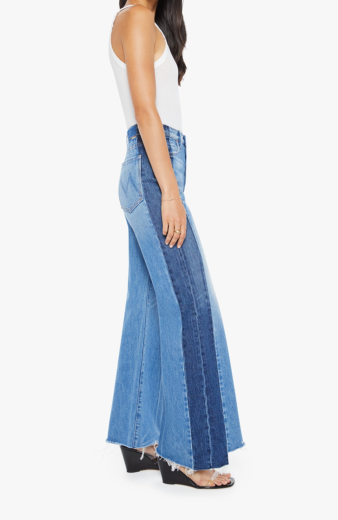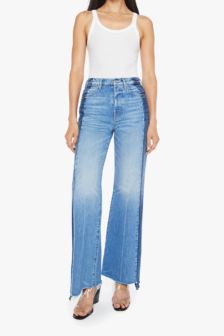 Twice as nice. High-waisted wide-leg jeans with a long 32-inch inseam and a frayed, uneven hem. Made from semi-rigid SUPERIOR denim, Double Stacked is mid blue with whiskering, fading and darker panels down the outer leg.