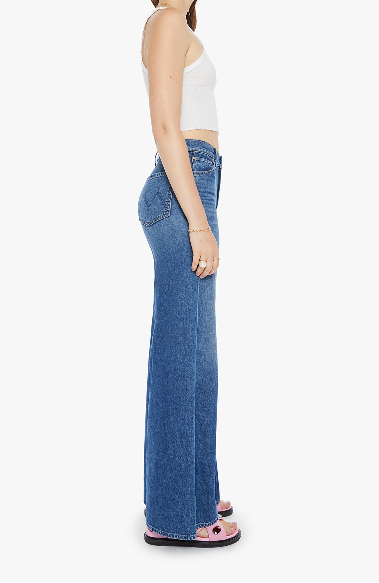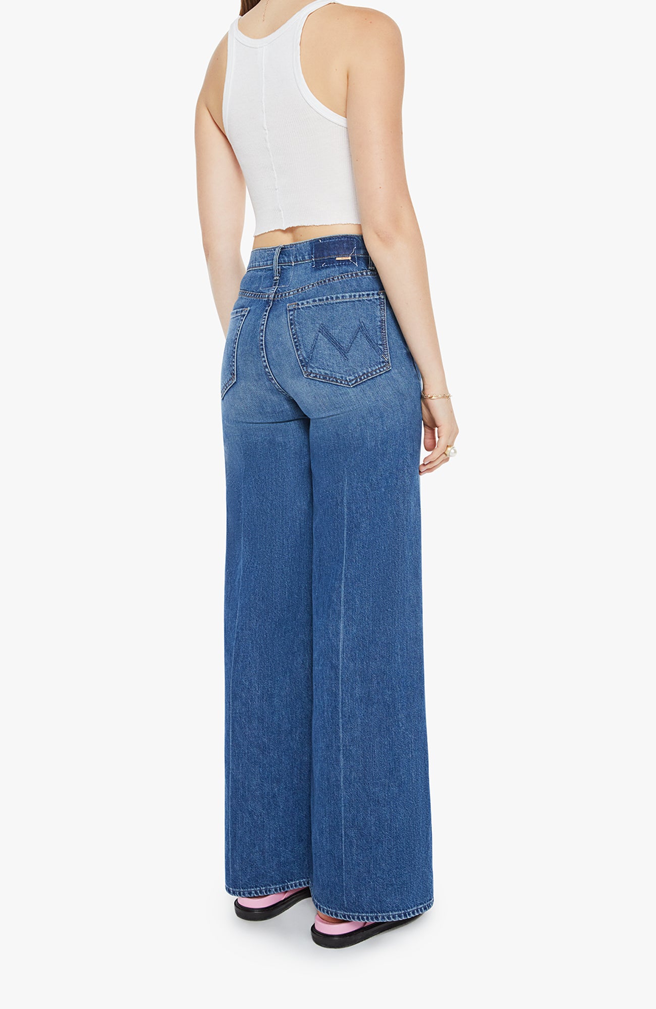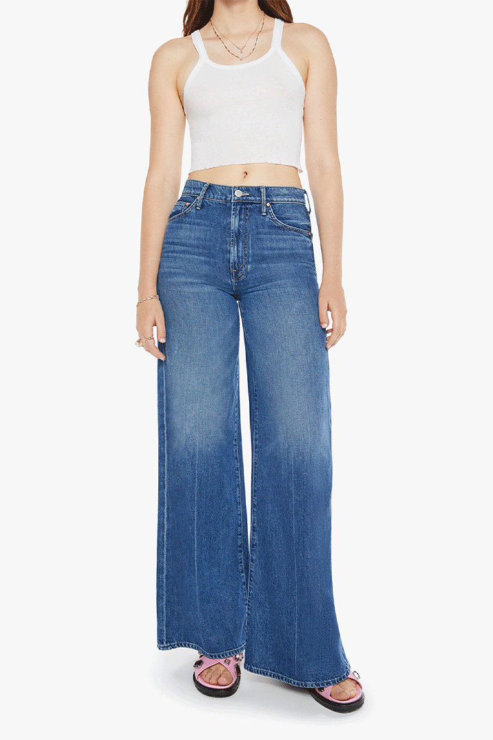 Glow up. Wide leg pants with a high rise, long 33-inch inseam and a clean hem. Made from rigid SUPERIOR denim, Rags To Riches is a mid-blue wash with whiskering and fading at the knee.