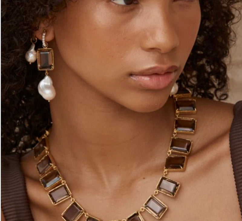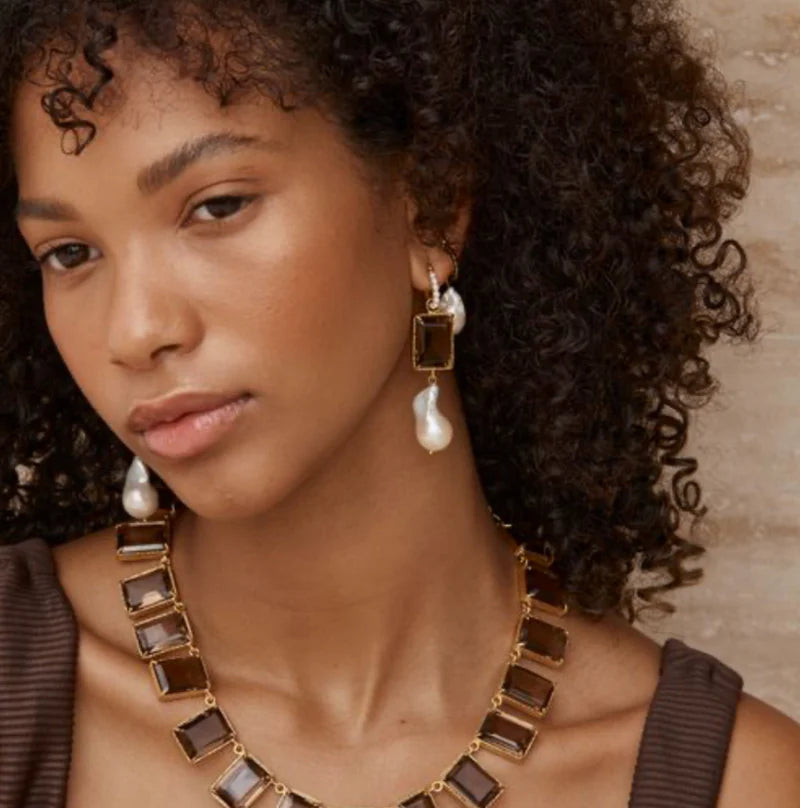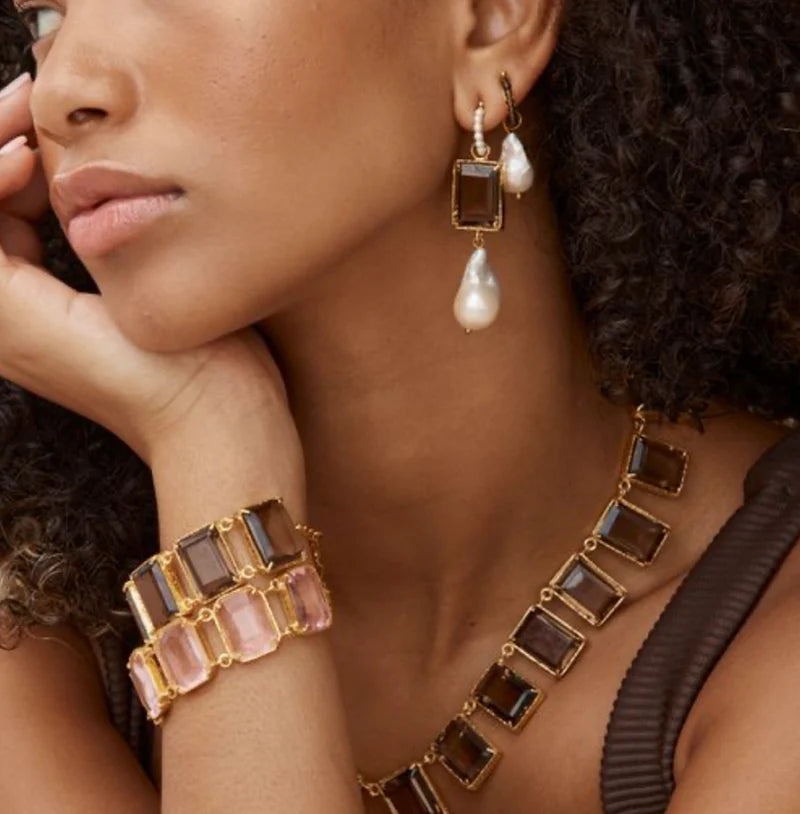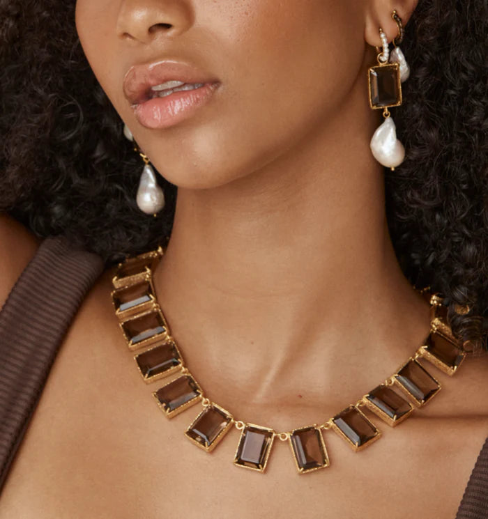 The handcrafted Valentina is adorned with vivid chocolate crystal stones.