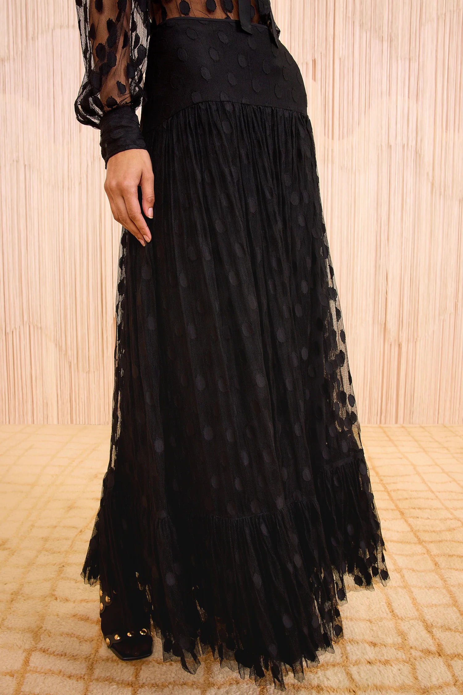 Look 6 on the AW25 runway showcases the Vera Skirt, an ethereal black style in flowing gossamer lace with effortlessly playful polka dots. Designed to sit high on the waist, this skirt has delicate gathers that release to fluid volume alive in gesture.